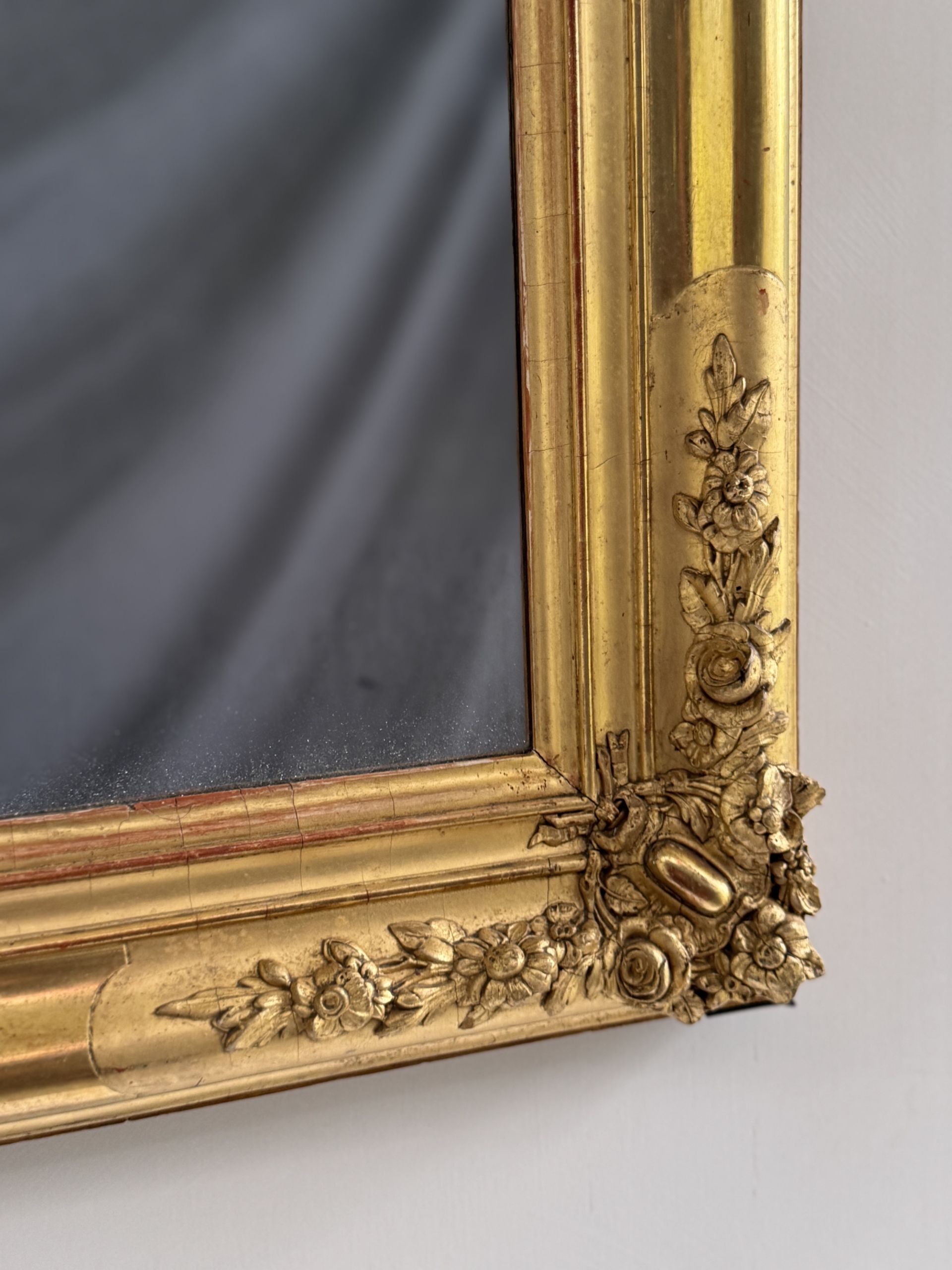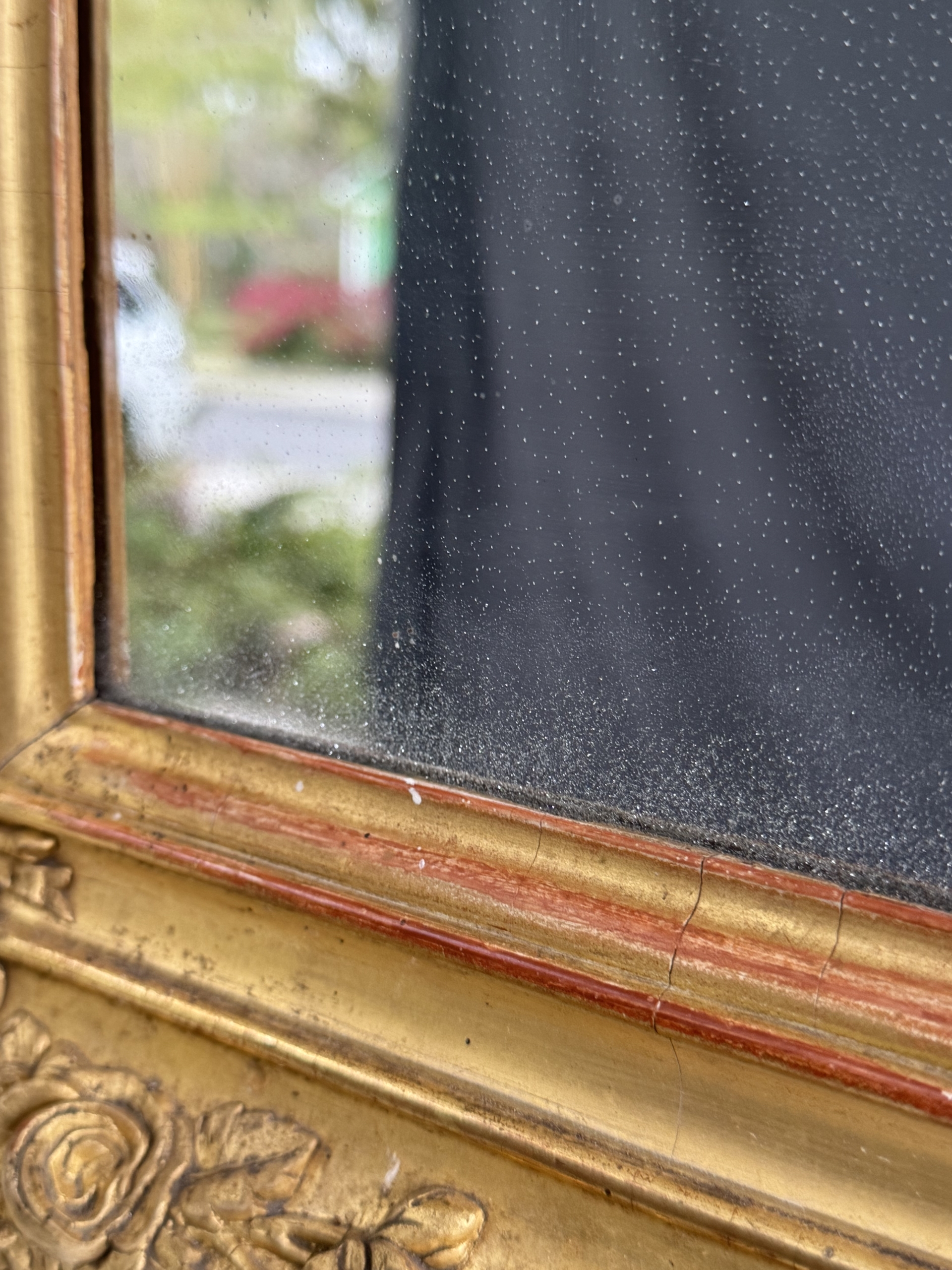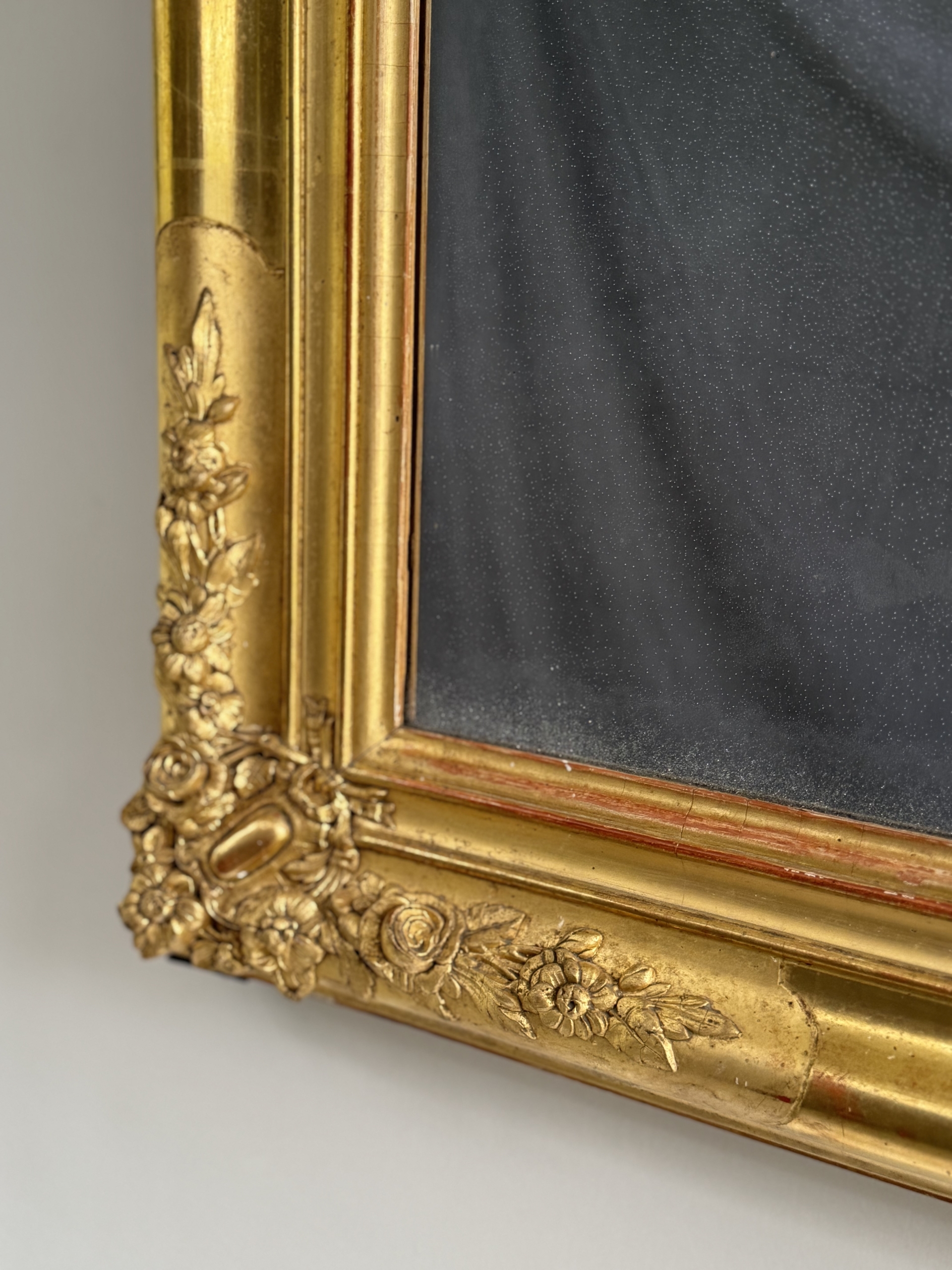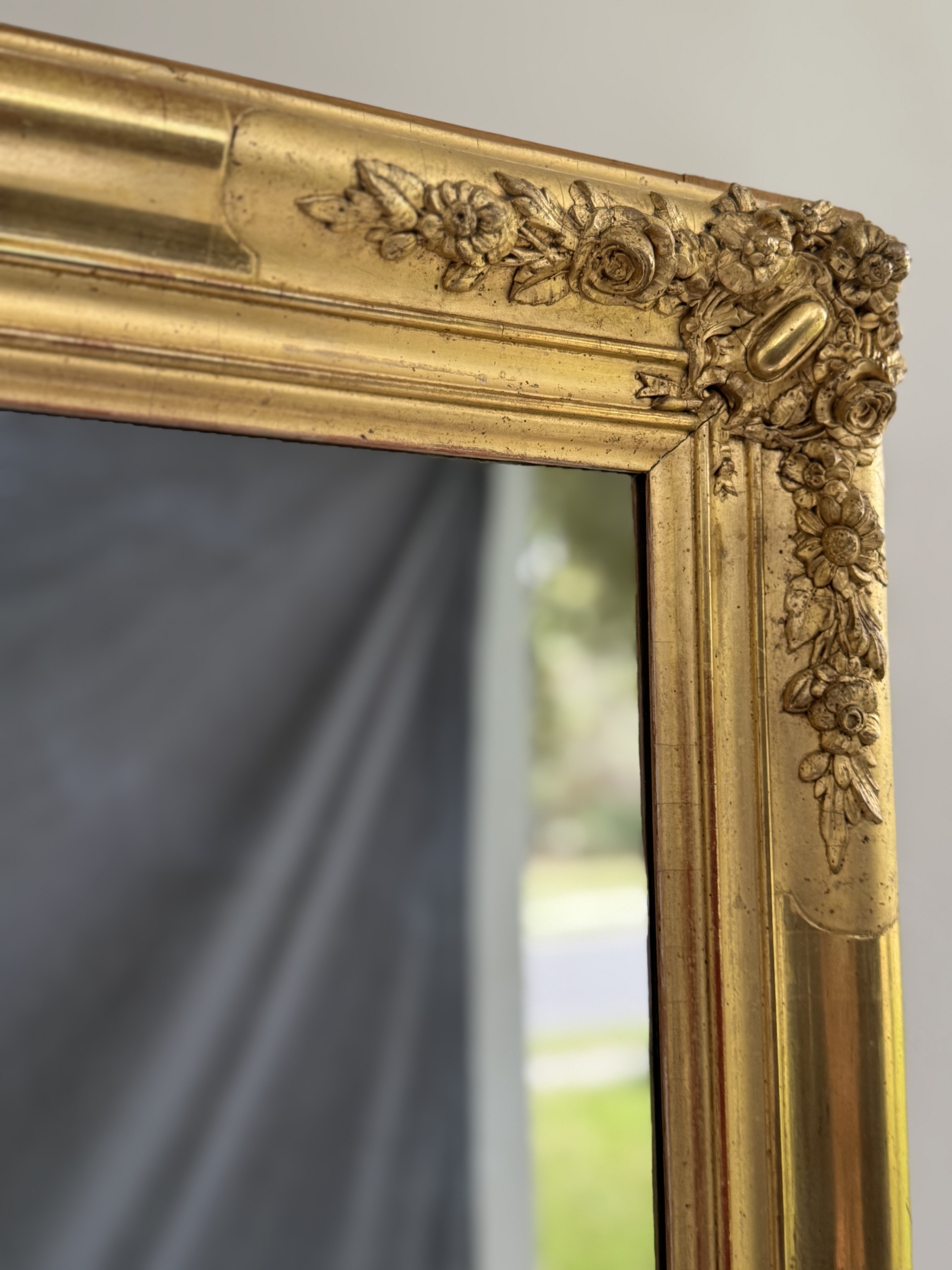 Early 19th c French Restoration water gilt mirror with original mercury silvered mirror. This mirror is in excellent condition and is decorated with rose and floral carvings and burnished and matte gold leaf gilding. Mirror can be hung vertically or horizontally.