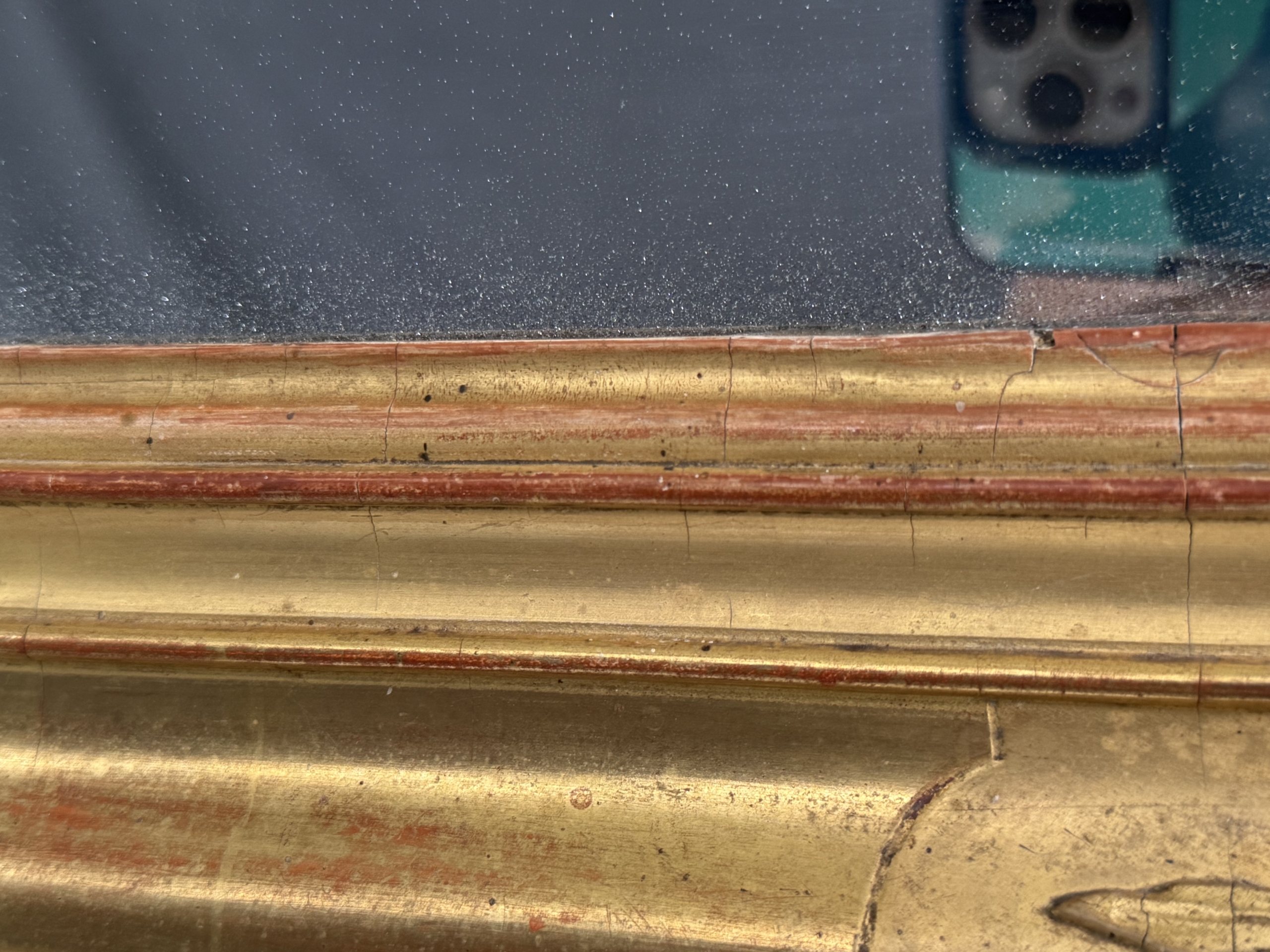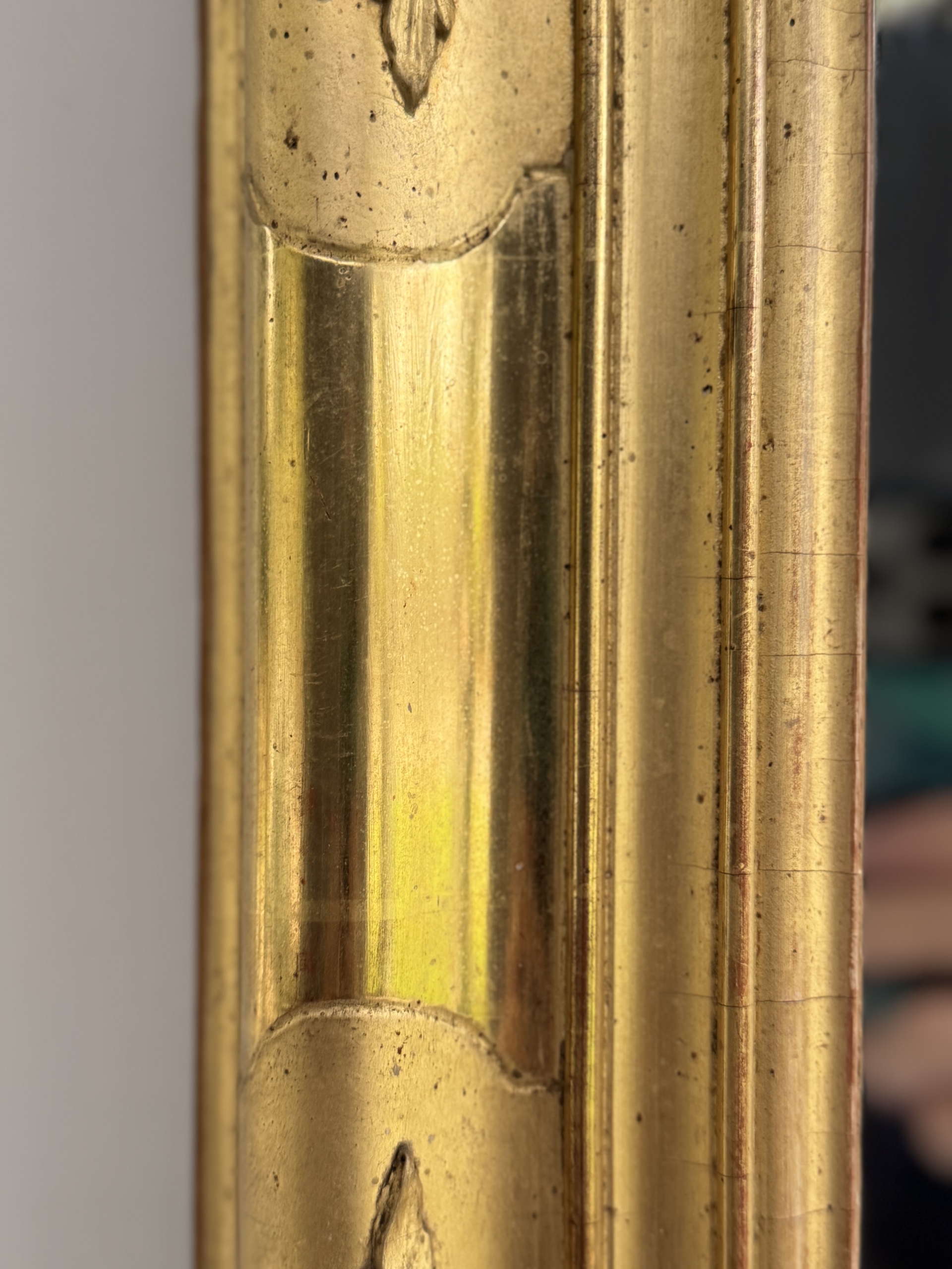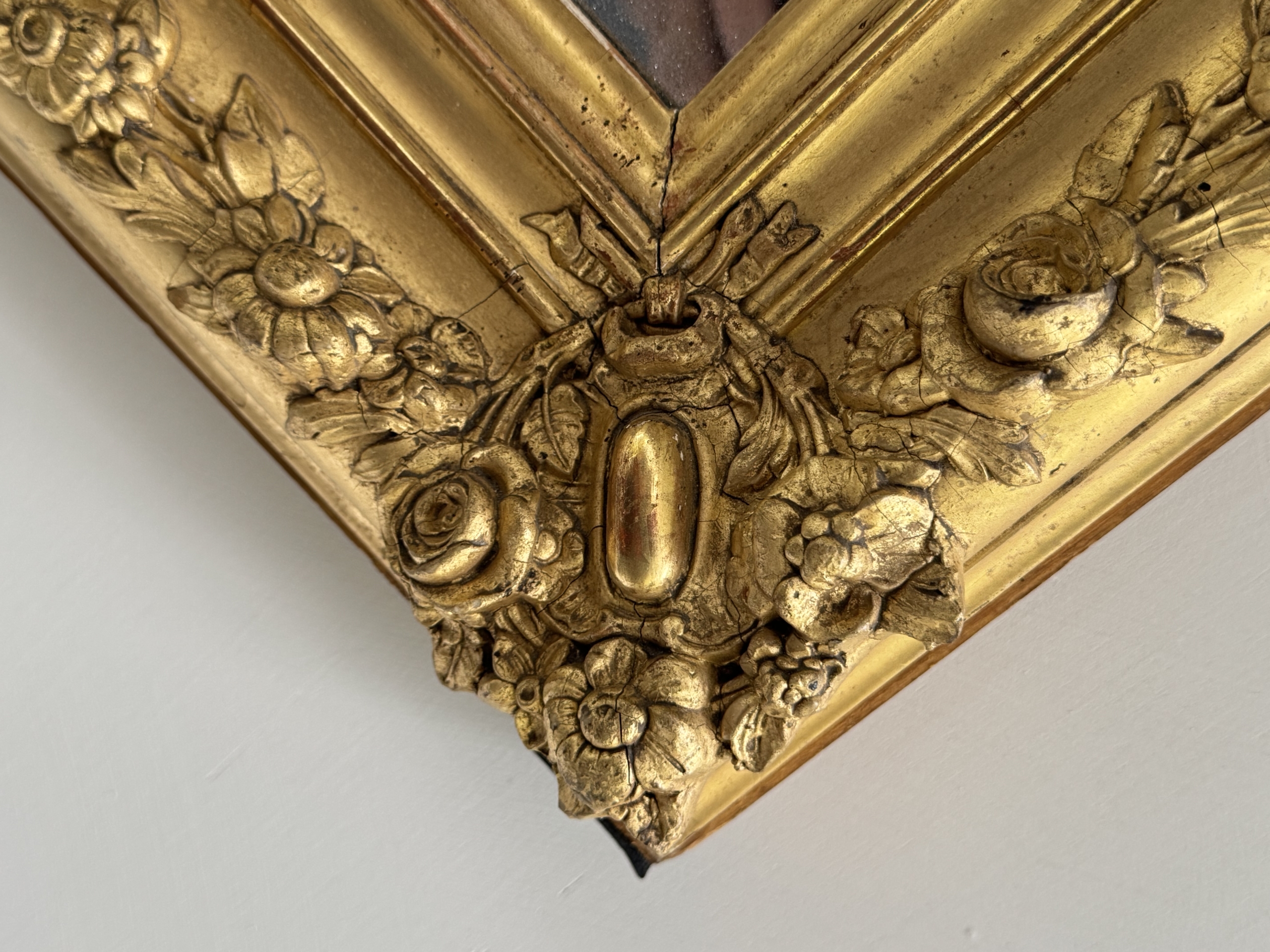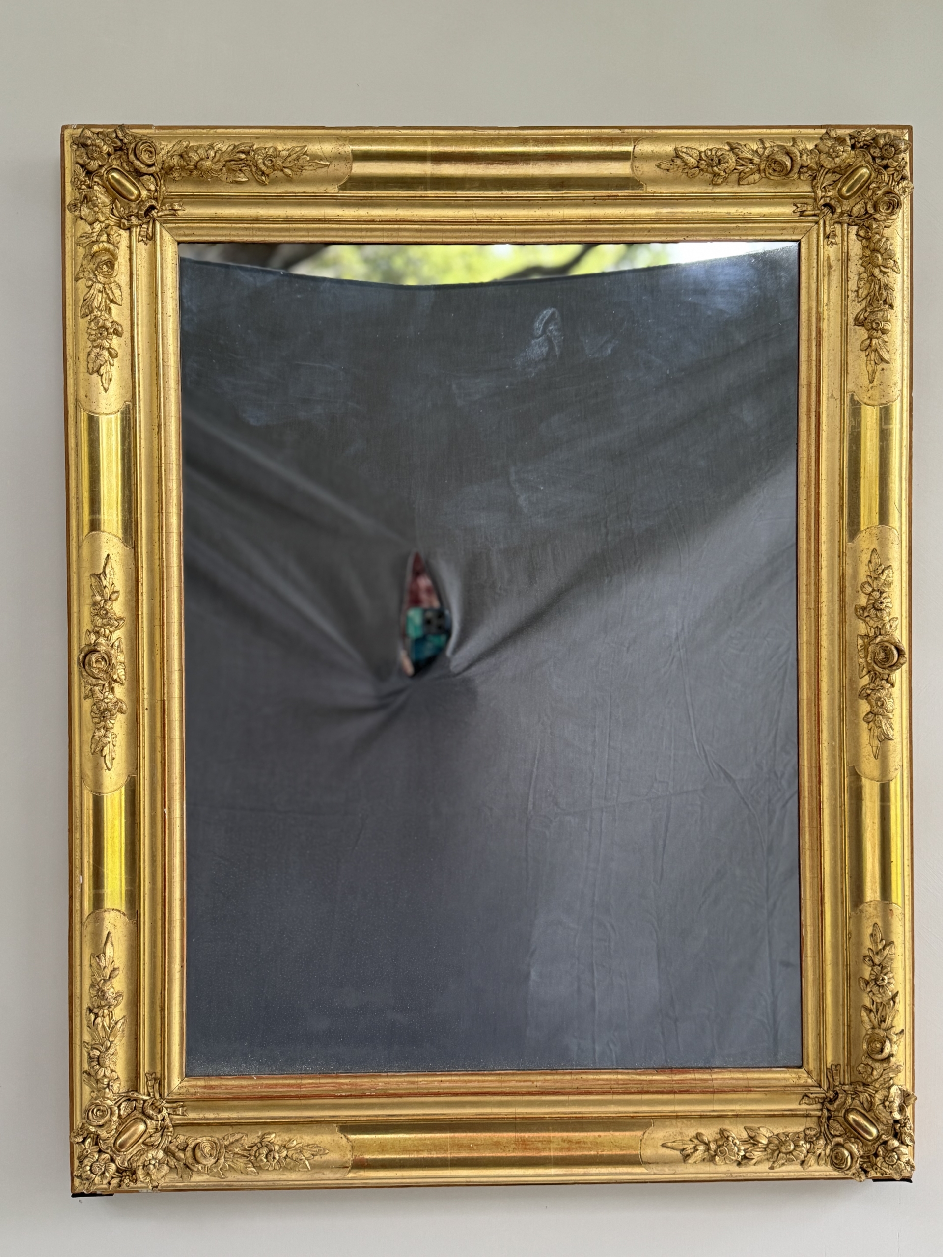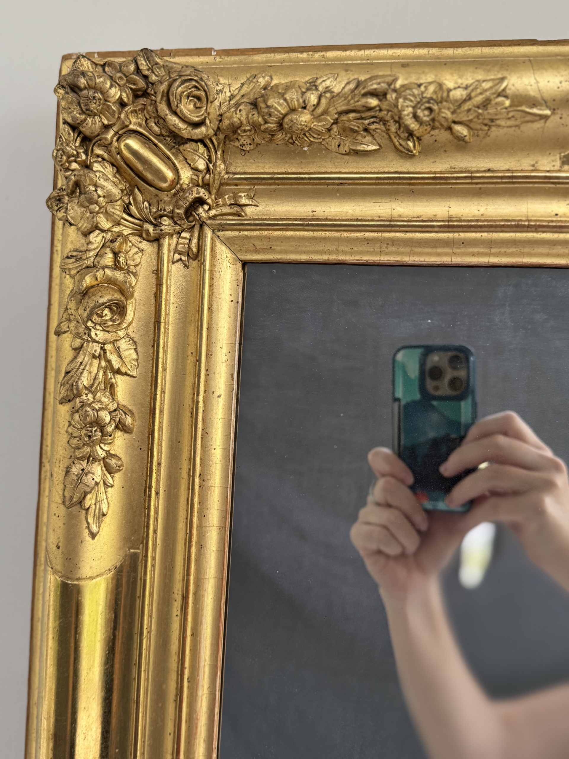 Early 19th c French Restoration water gilt mirror with original mercury silvered mirror. This mirror is in excellent condition and is decorated with rose and floral carvings and burnished and matte gold leaf gilding. Mirror can be hung vertically or horizontally.