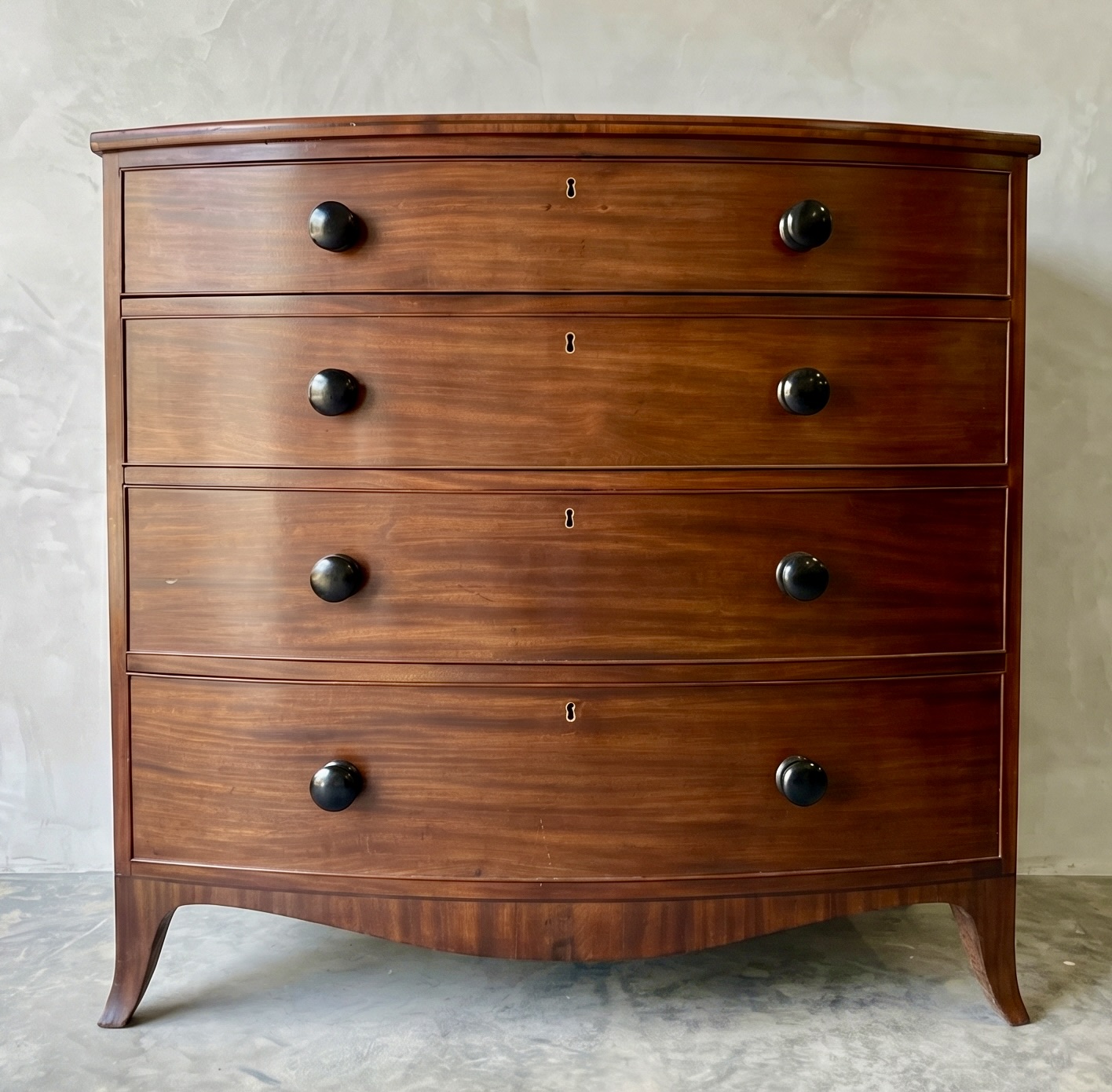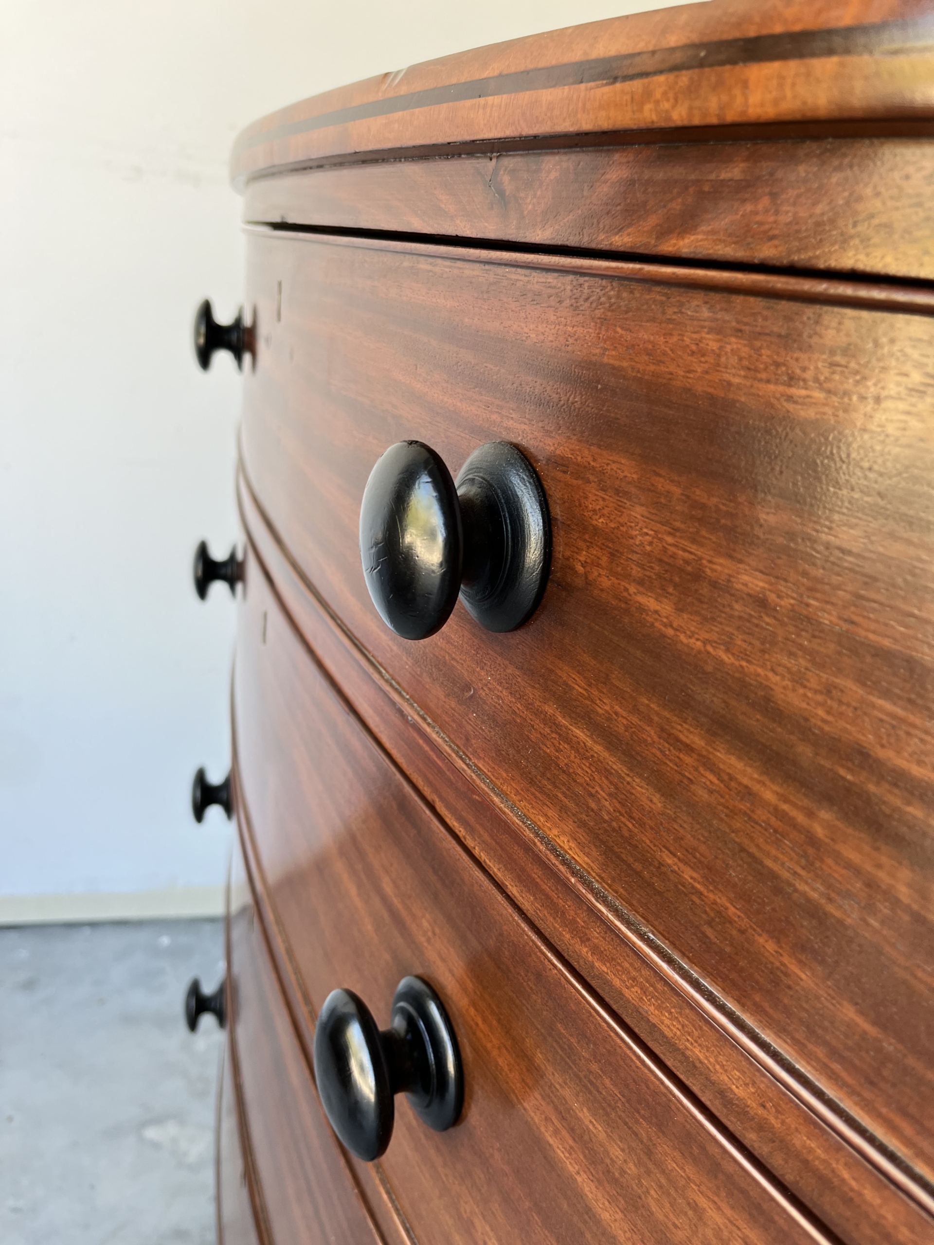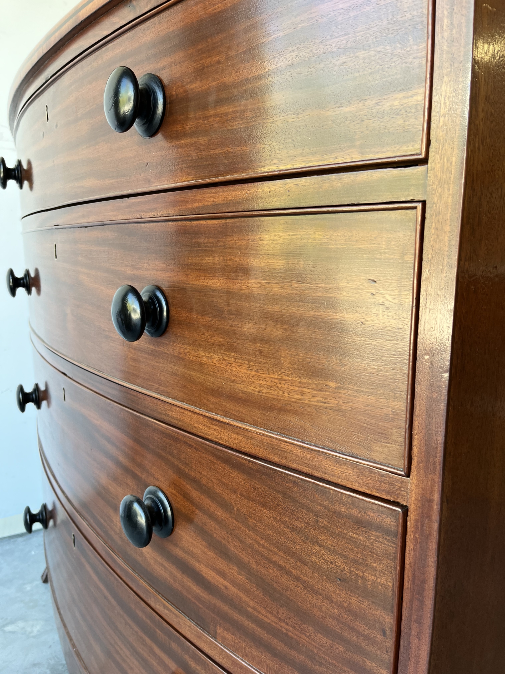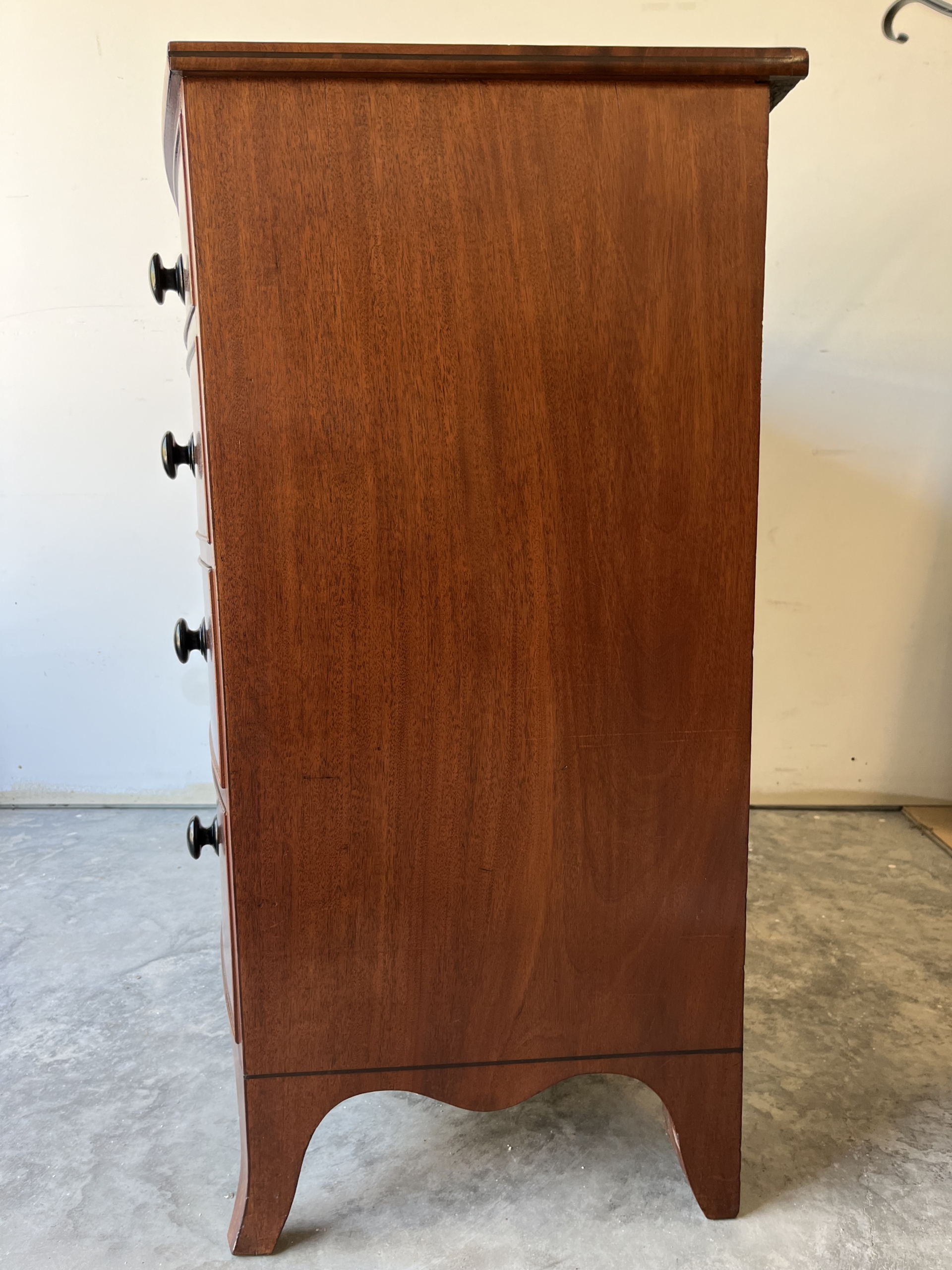 This Georgian bow front chest consists of 5 tiered cockbeaded drawer fronts are made of Mahogany.   The top and sides of this chest are exceptional in that they are made of solid planks of Mahogany.   The chest is supported by splay feet and handles that are ebonised to match the thin black line of inlay that gently outlines the top and accents the bottom of the Chest. Drawers have original paper and  hand cut dovetails. The Chest is in excellent condition with all cockbeading in tact. There is one small split in the right side toward the top as seen in photo, apron 6″ in length.