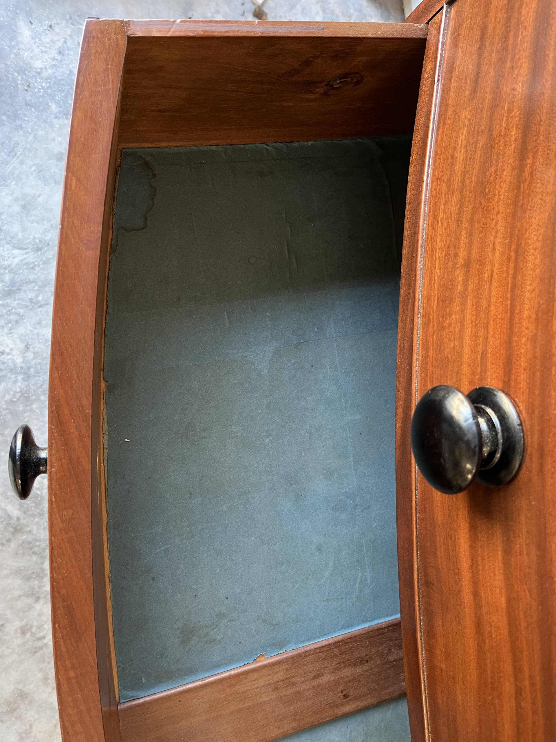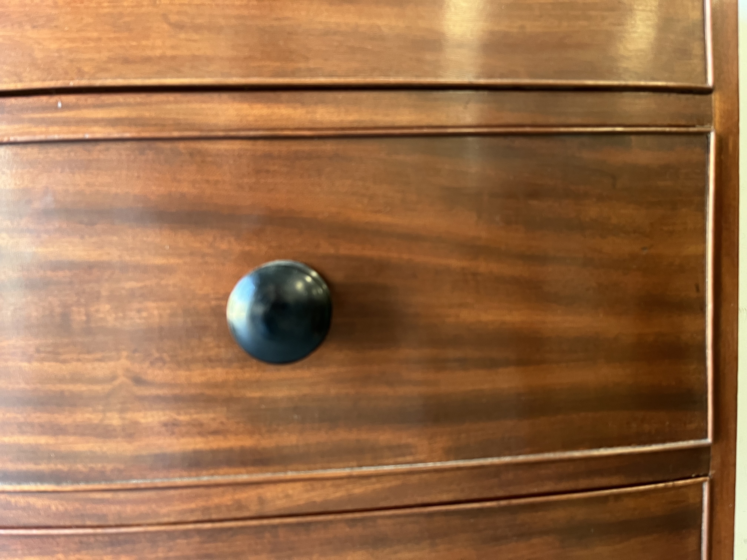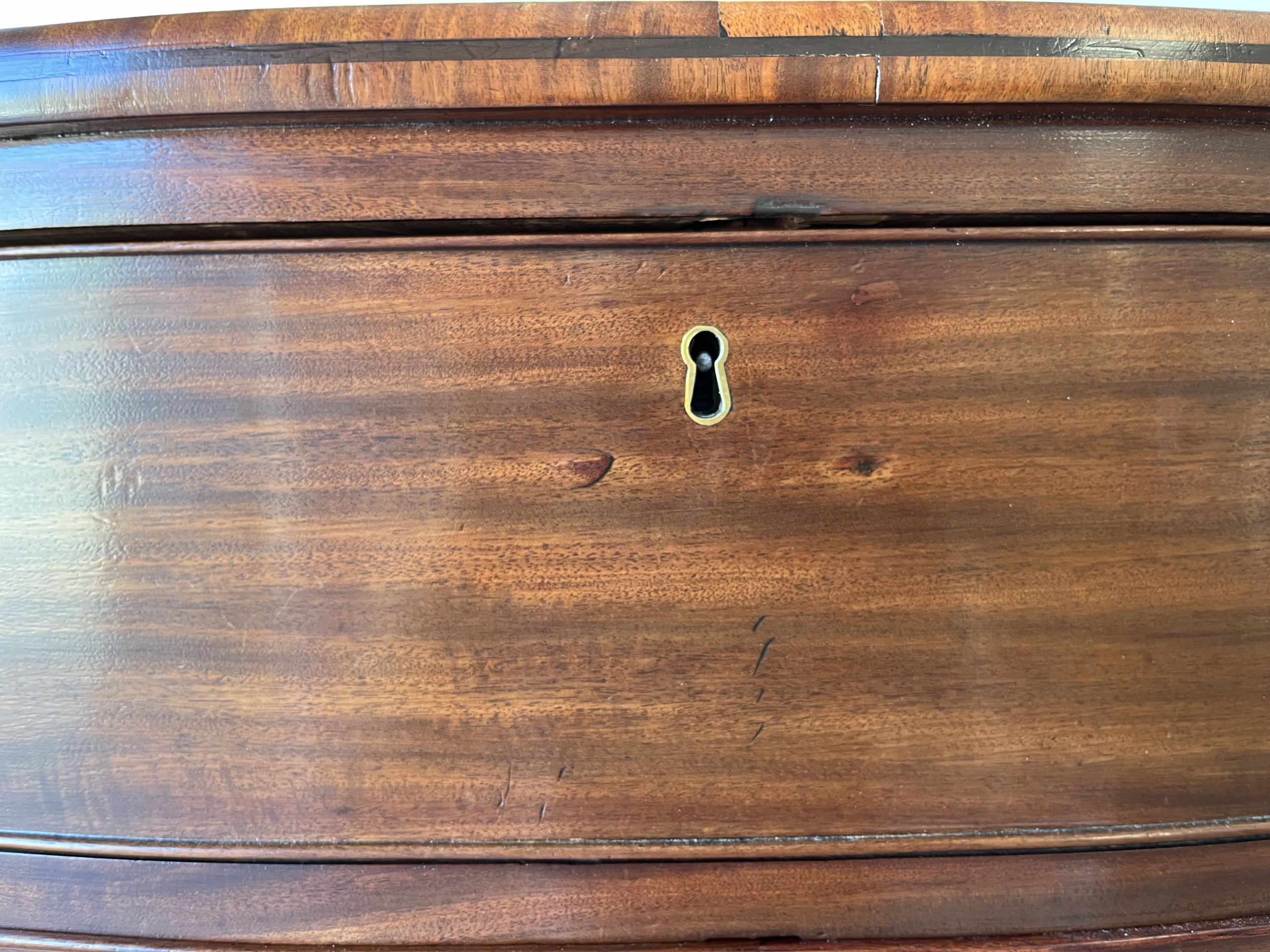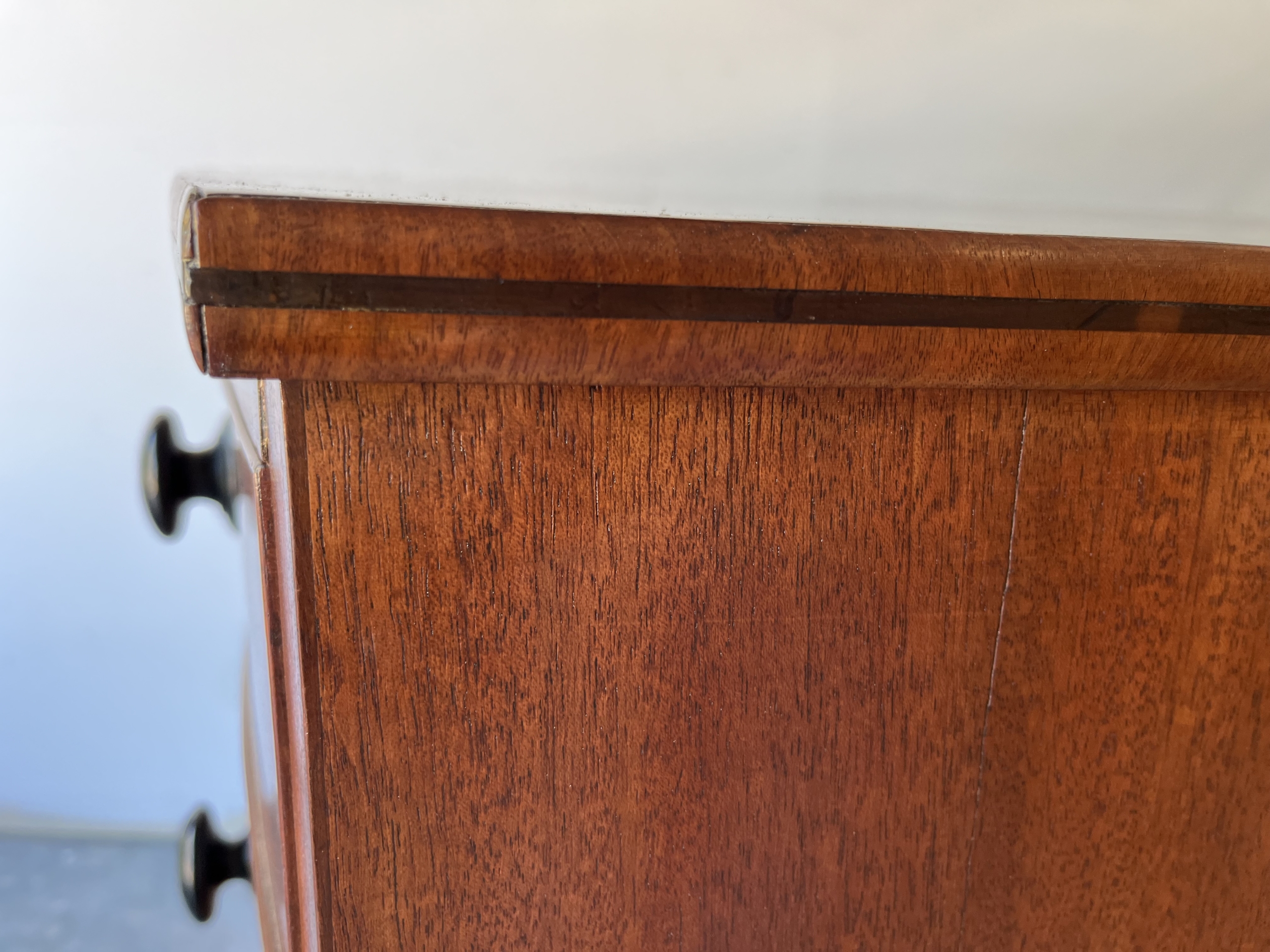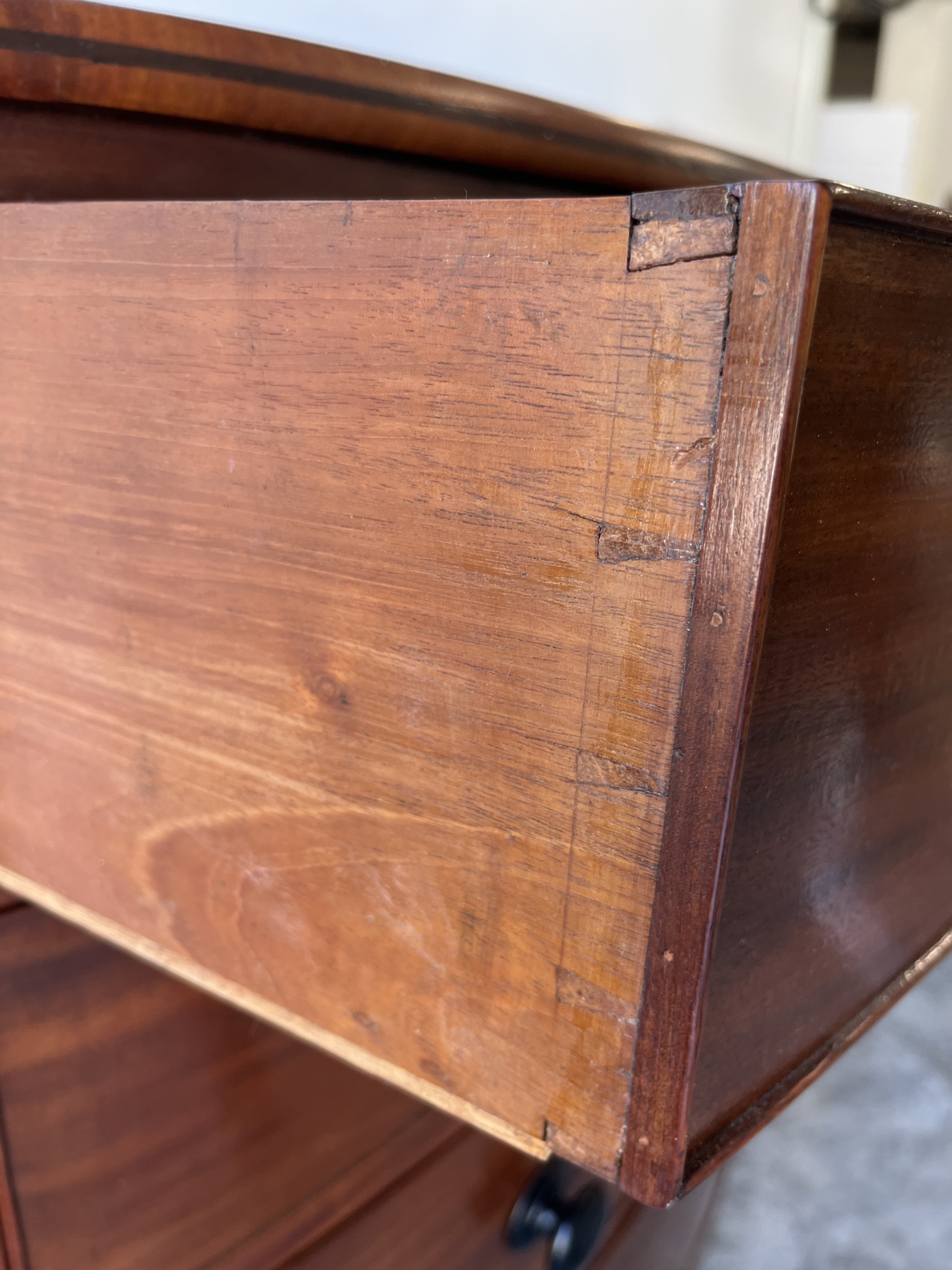 This Georgian bow front chest consists of 5 tiered cockbeaded drawer fronts are made of Mahogany.   The top and sides of this chest are exceptional in that they are made of solid planks of Mahogany.   The chest is supported by splay feet and handles that are ebonised to match the thin black line of inlay that gently outlines the top and accents the bottom of the Chest. Drawers have original paper and  hand cut dovetails. The Chest is in excellent condition with all cockbeading in tact. There is one small split in the right side toward the top as seen in photo, apron 6″ in length.