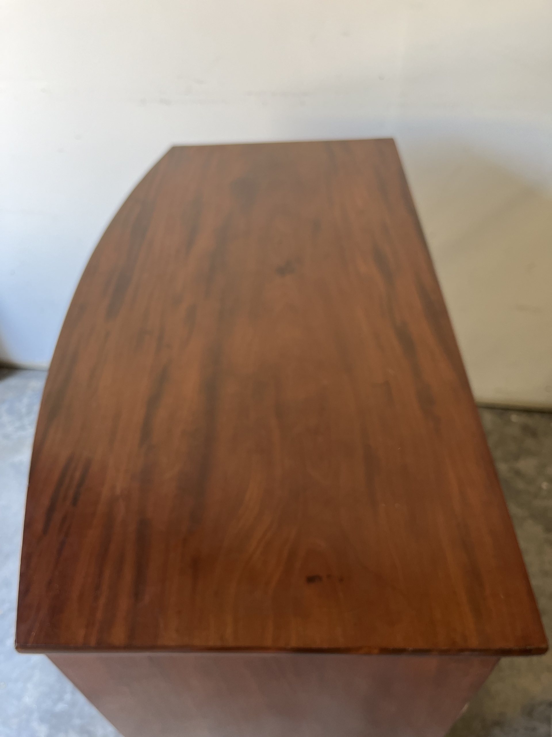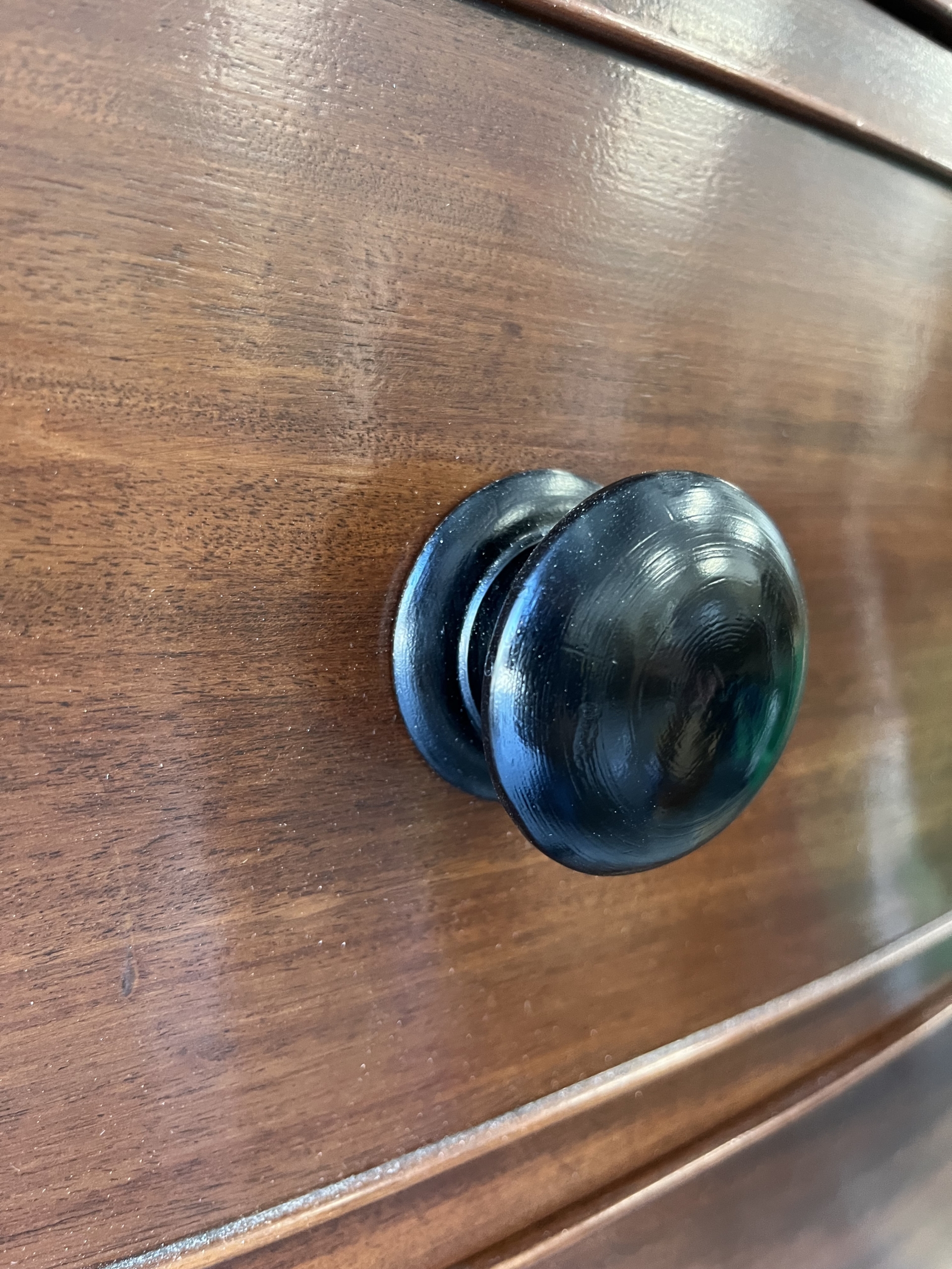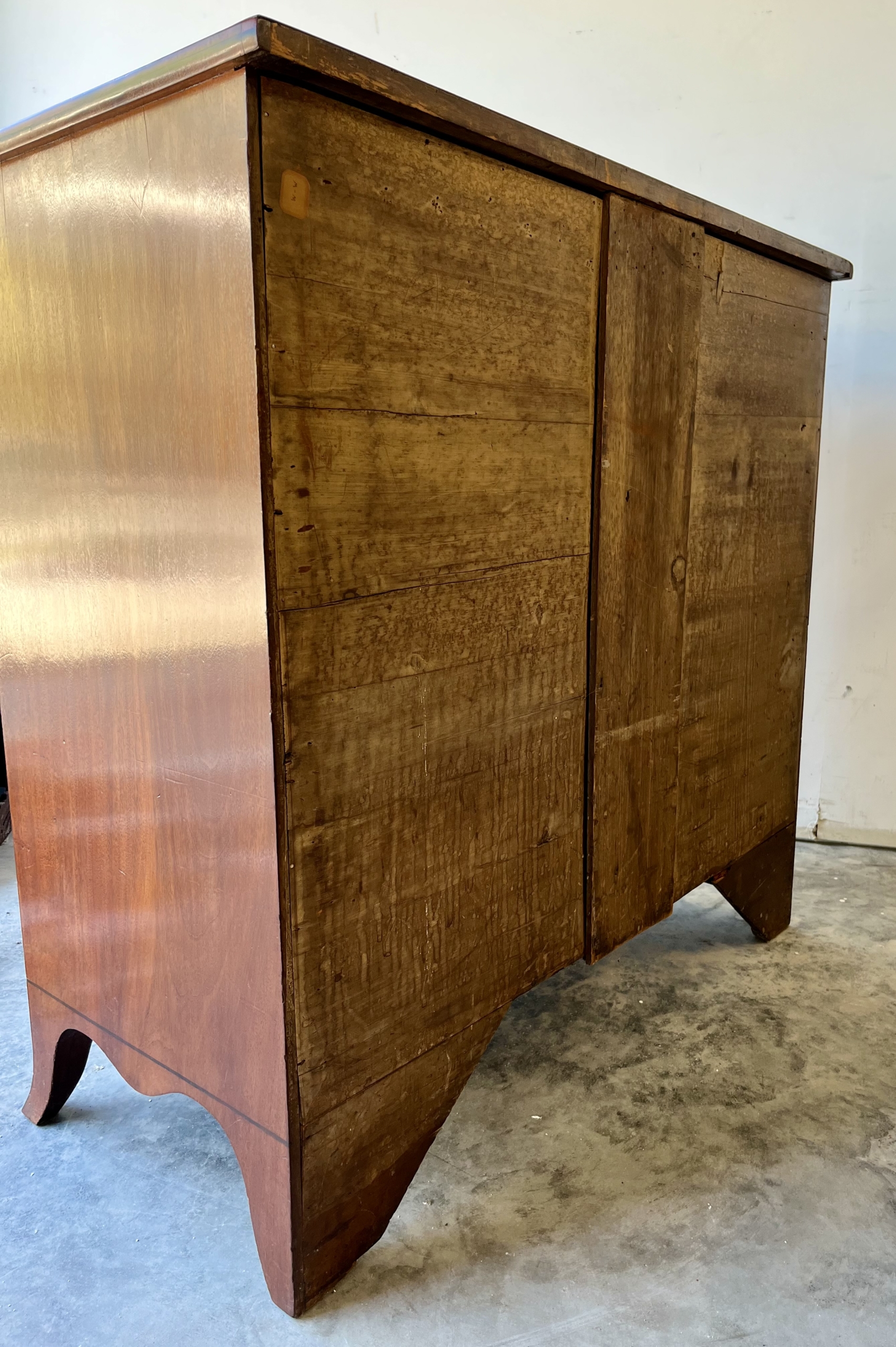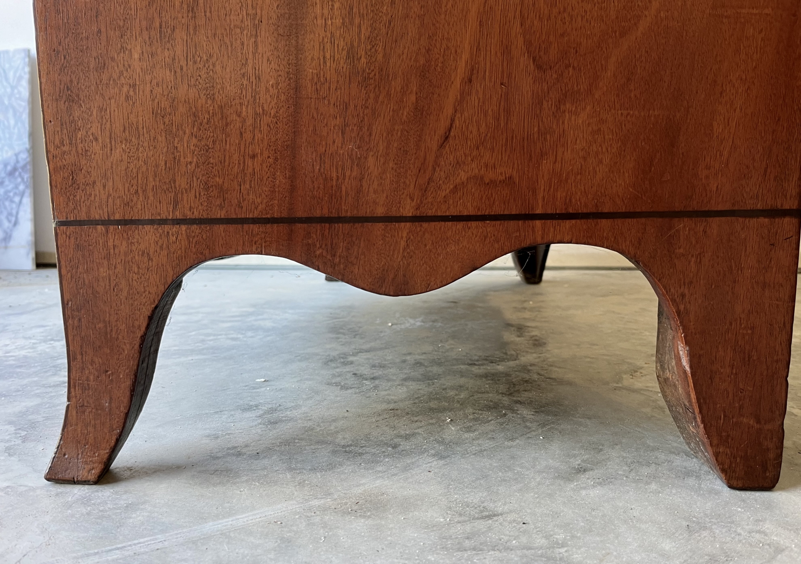This Georgian bow front chest consists of 5 tiered cockbeaded drawer fronts are made of Mahogany.   The top and sides of this chest are exceptional in that they are made of solid planks of Mahogany.   The chest is supported by splay feet and handles that are ebonised to match the thin black line of inlay that gently outlines the top and accents the bottom of the Chest. Drawers have original paper and  hand cut dovetails. The Chest is in excellent condition with all cockbeading in tact. There is one small split in the right side toward the top as seen in photo, apron 6″ in length.