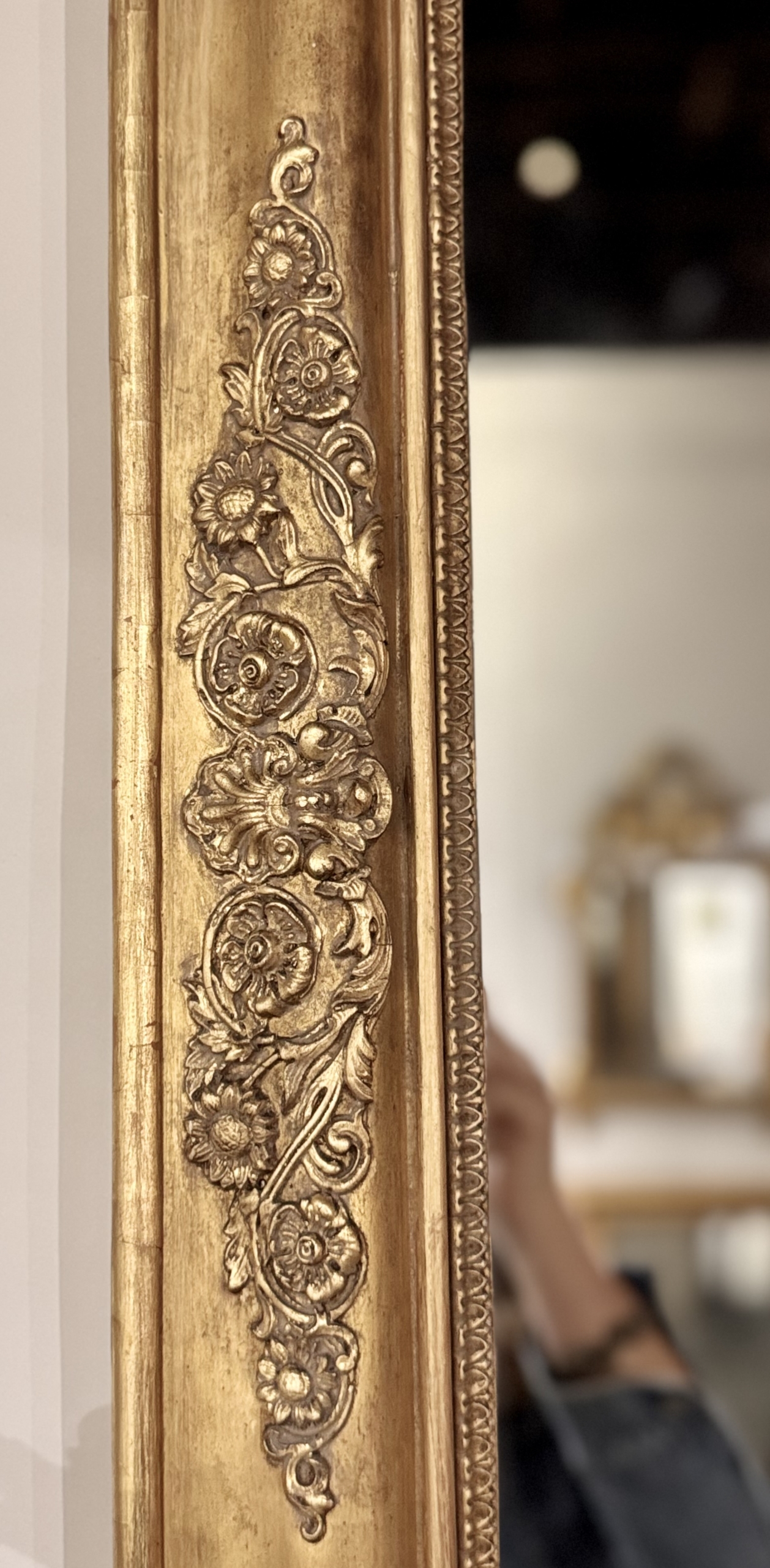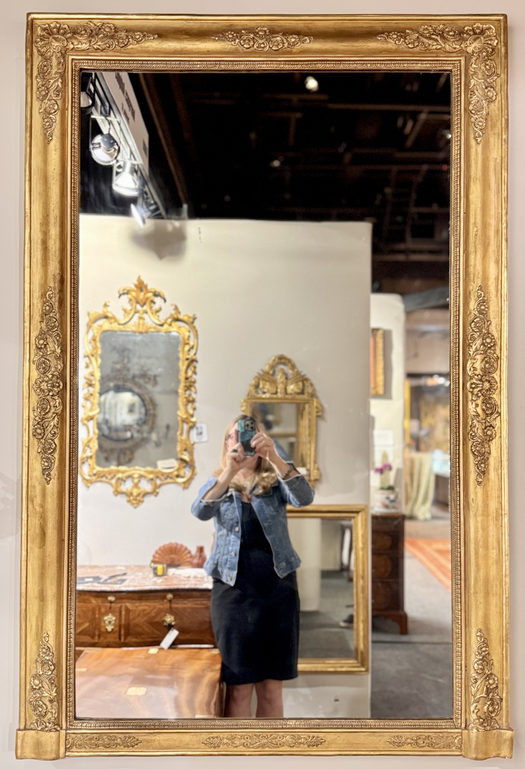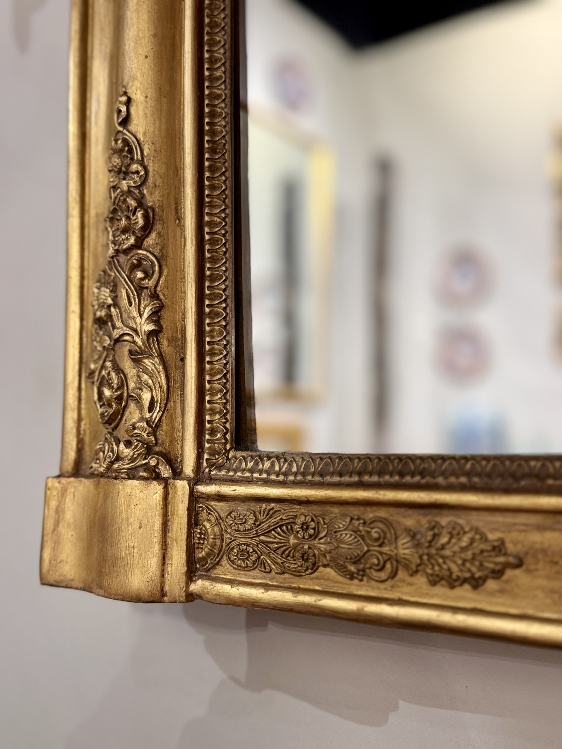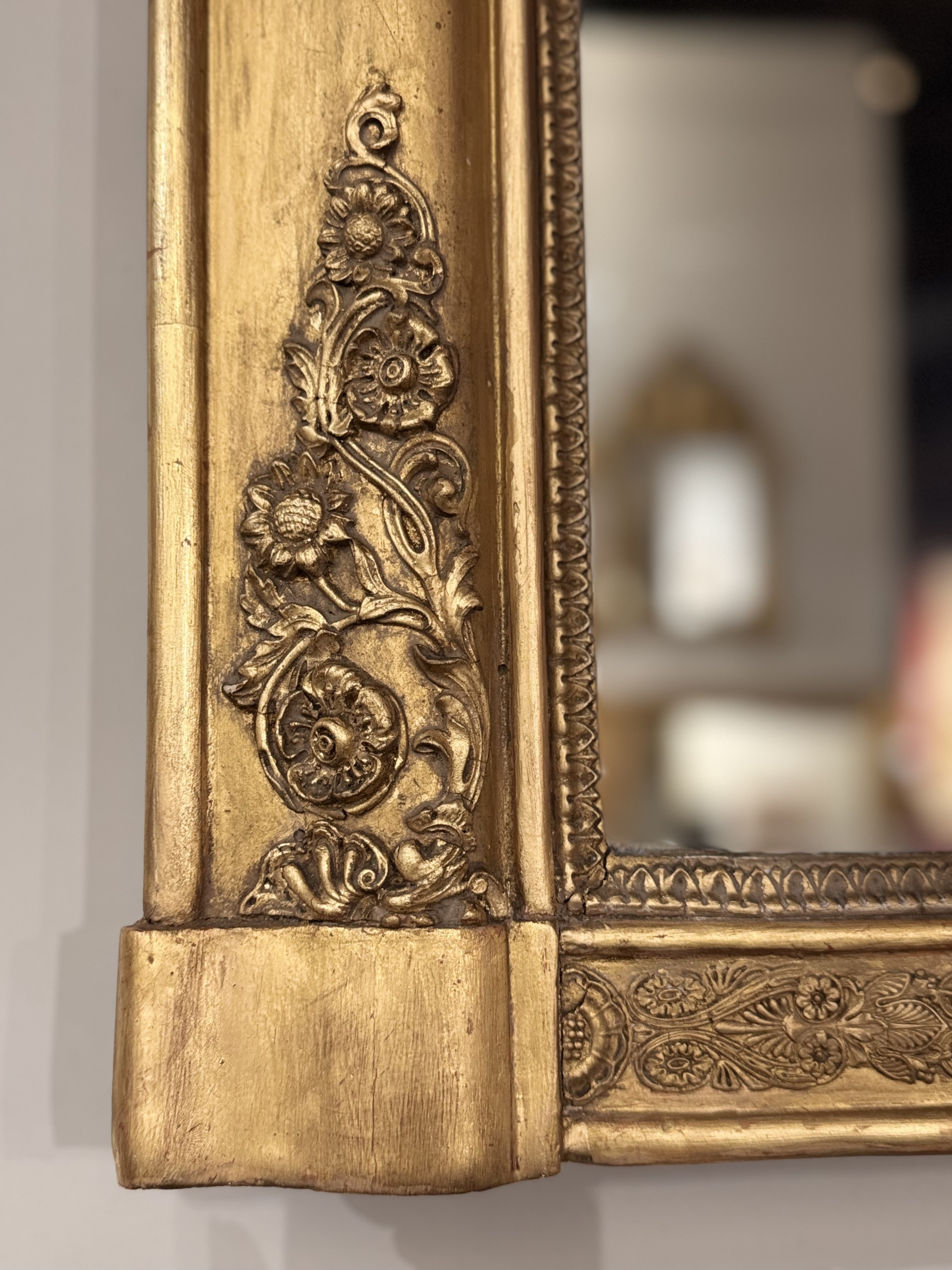 French Empire period Mantel Mirror. This sophisticated Empire period mirror is in excellent condition with a combination matt and burnished gilding and a lovely patina to accent the decorations. Mirror glass is silvered with some faint scratches typical of an antique glass. Signed “LUCE” Miroiterie Dorure “Versailles”
