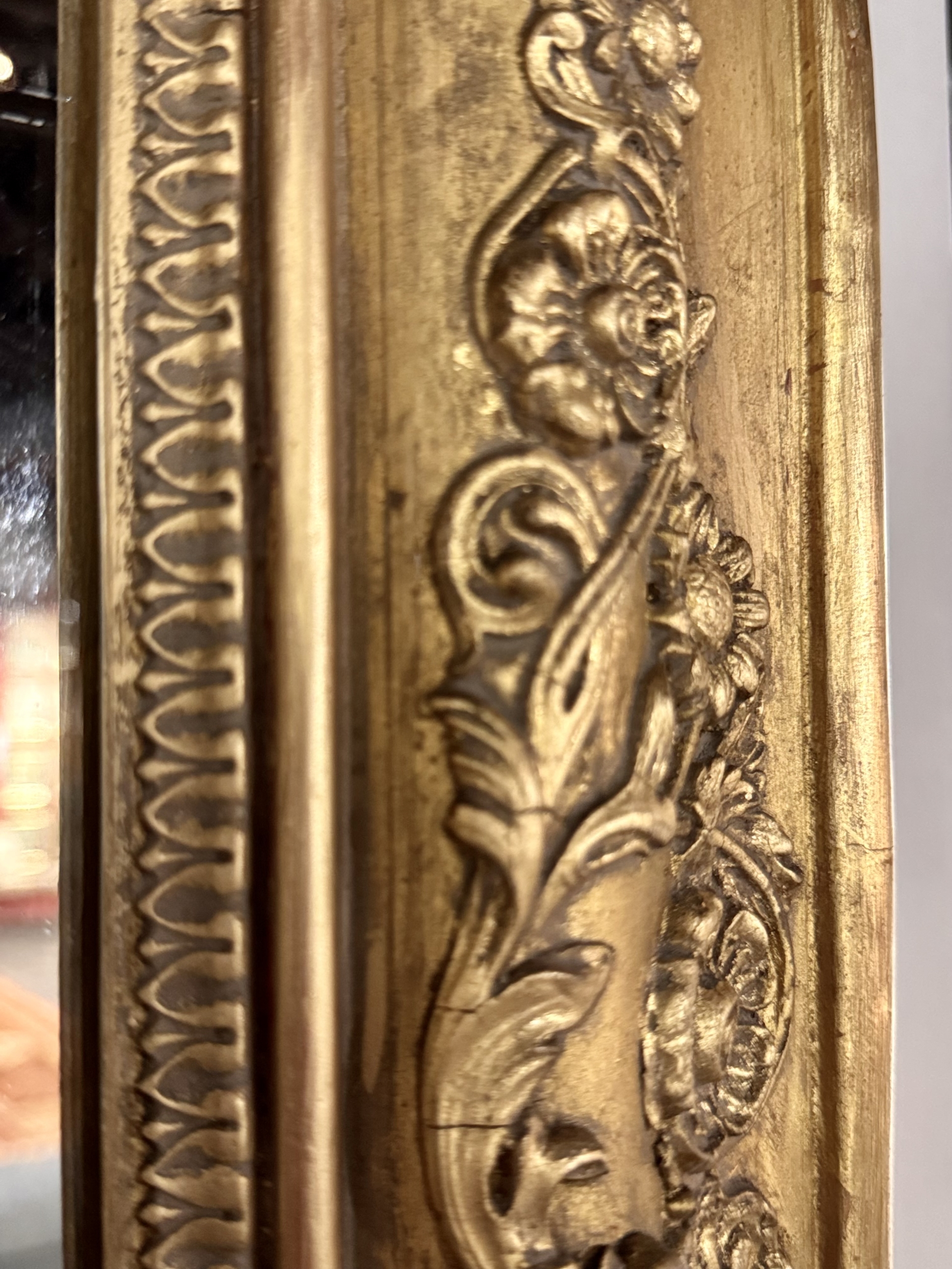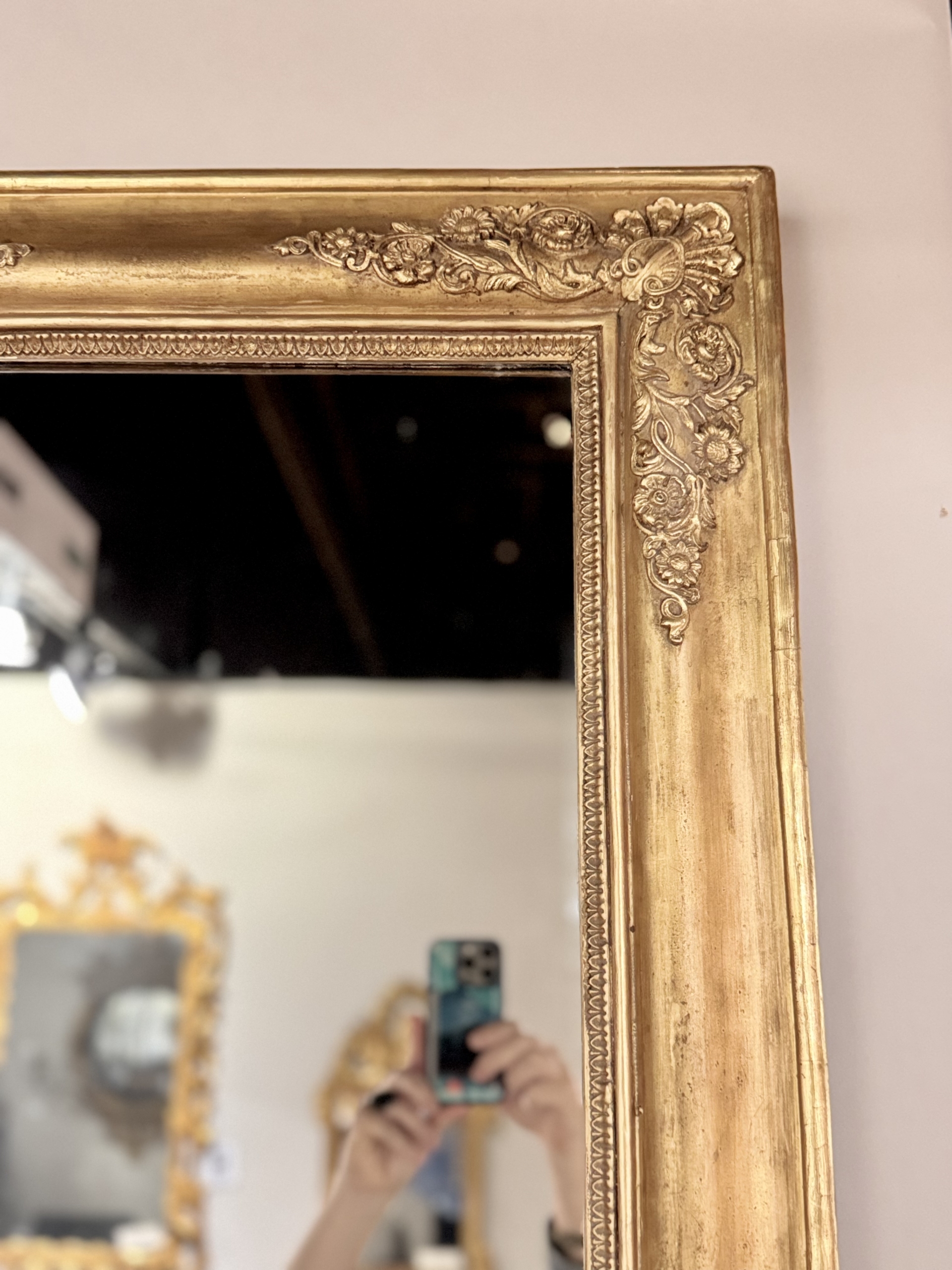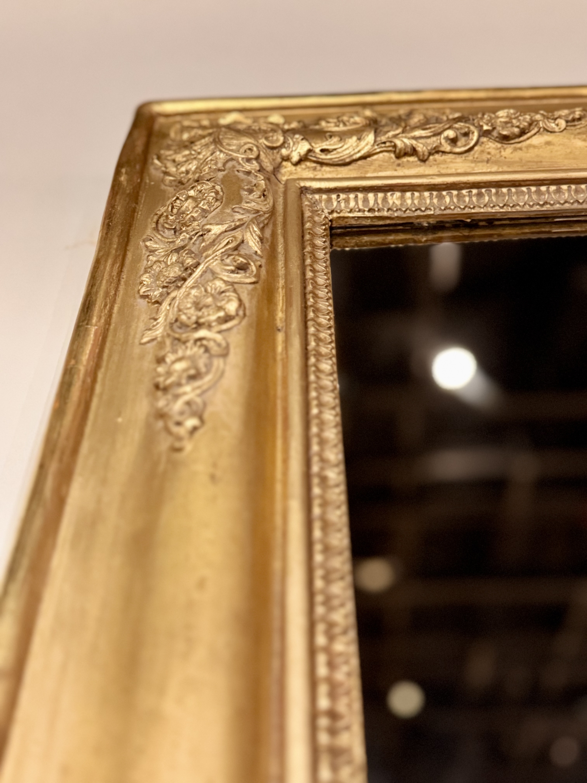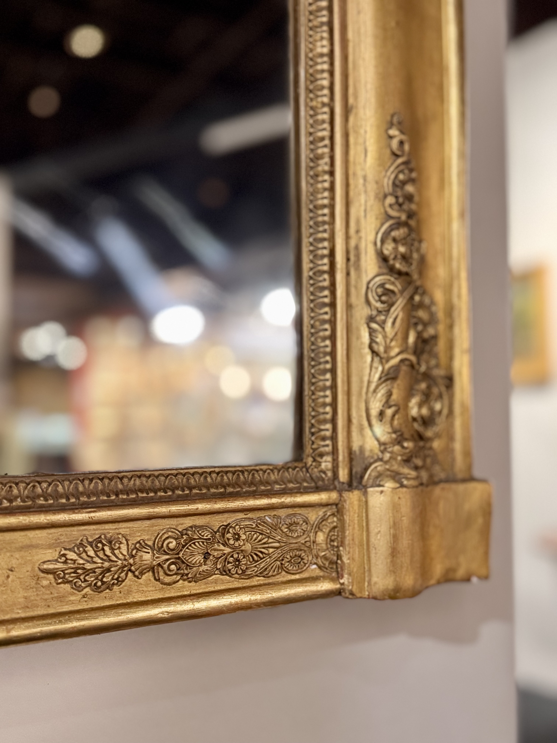 French Empire period Mantel Mirror. This sophisticated Empire period mirror is in excellent condition with a combination matt and burnished gilding and a lovely patina to accent the decorations. Mirror glass is silvered with some faint scratches typical of an antique glass. Signed “LUCE” Miroiterie Dorure “Versailles”