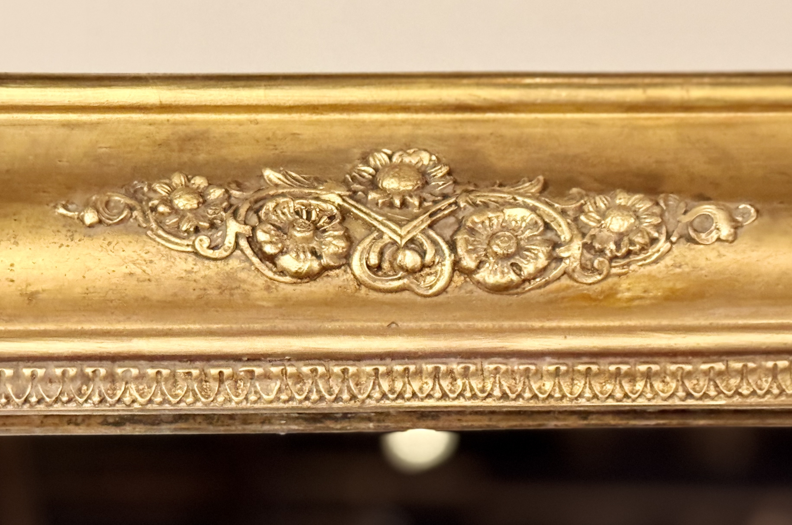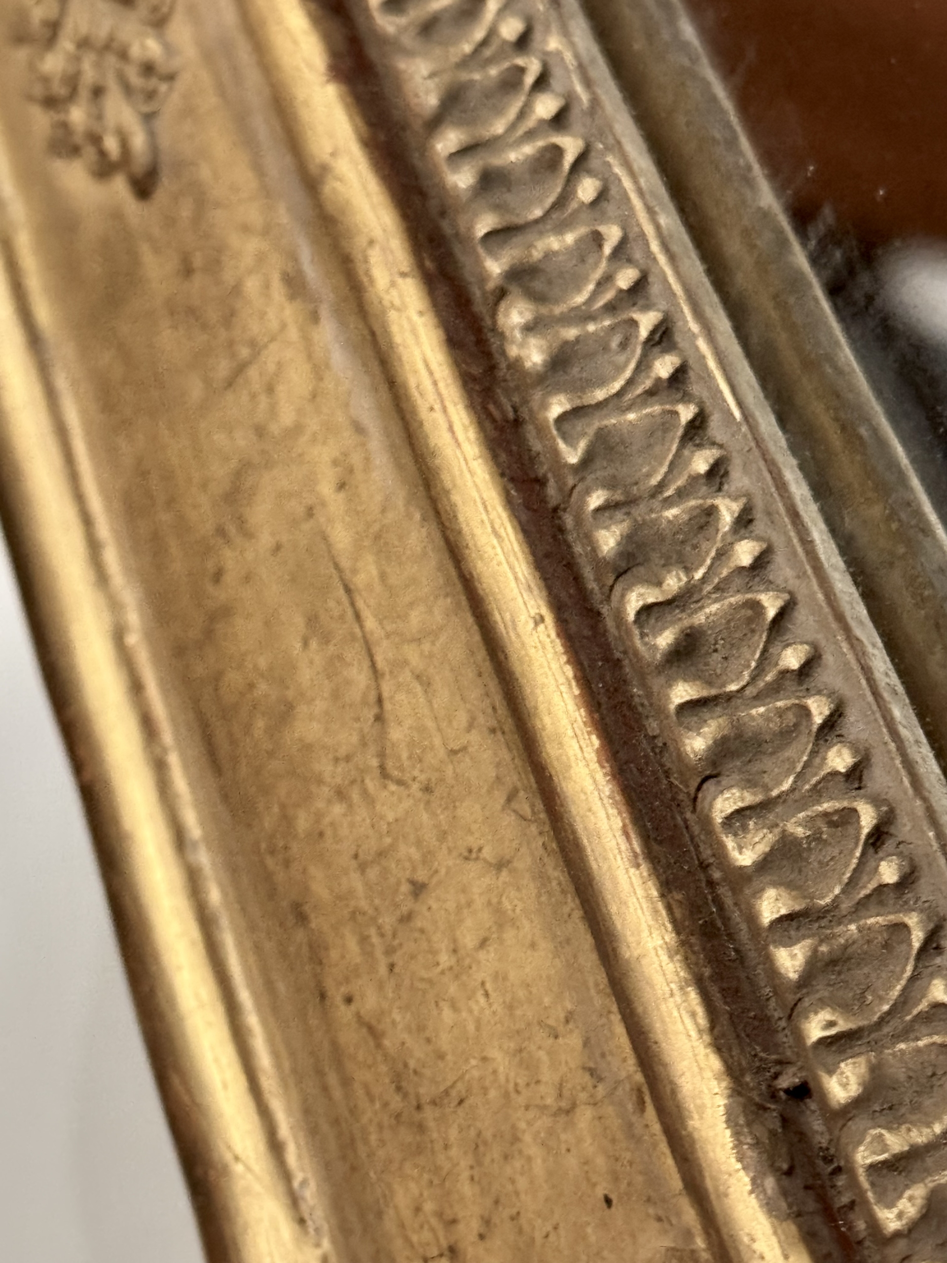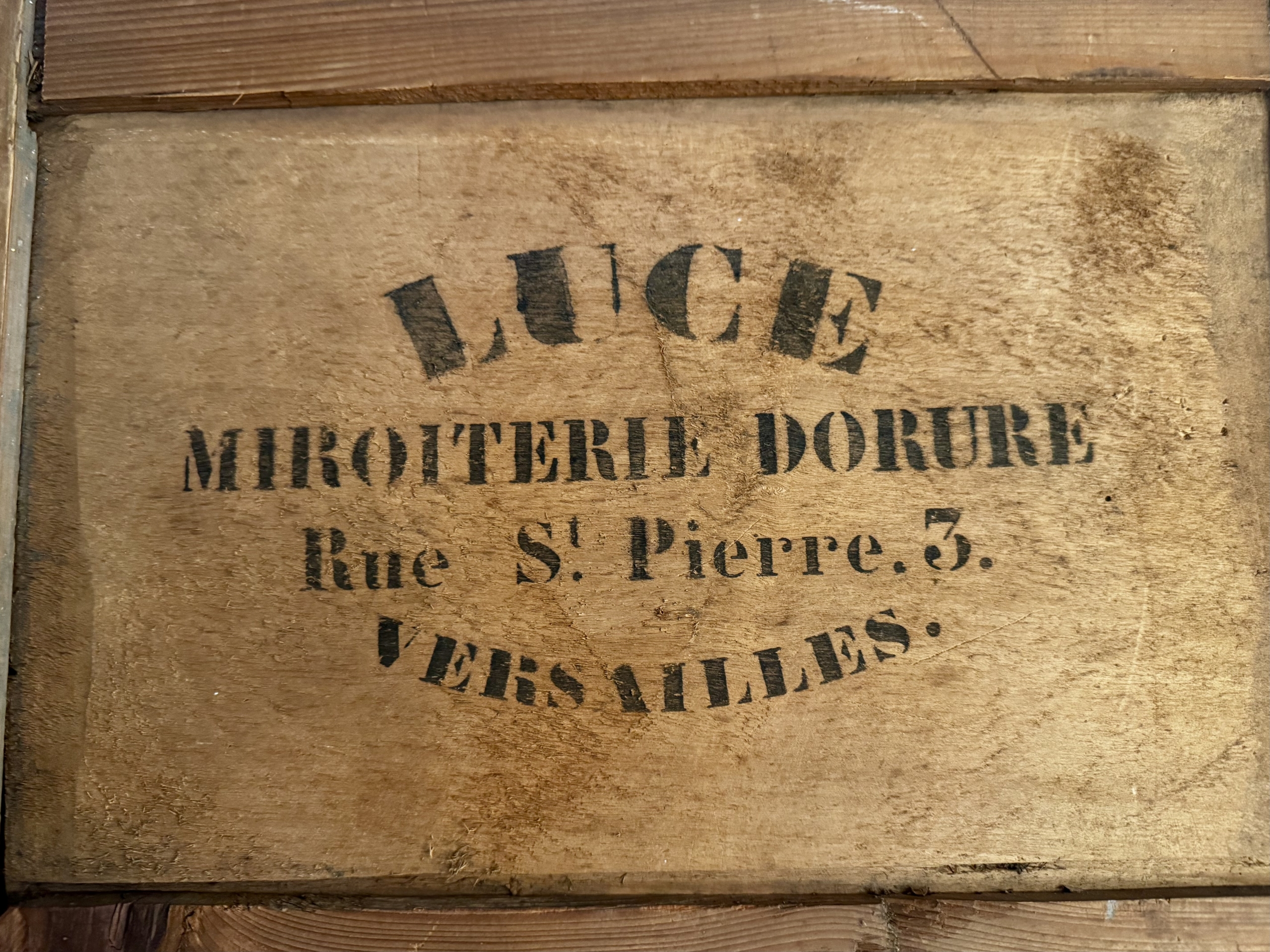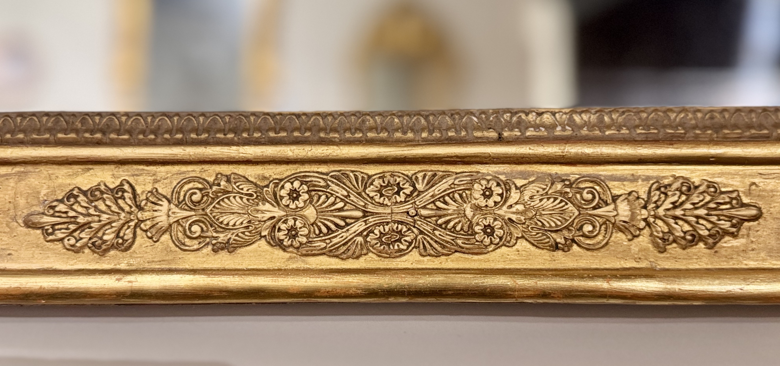 French Empire period Mantel Mirror. This sophisticated Empire period mirror is in excellent condition with a combination matt and burnished gilding and a lovely patina to accent the decorations. Mirror glass is silvered with some faint scratches typical of an antique glass. Signed “LUCE” Miroiterie Dorure “Versailles”