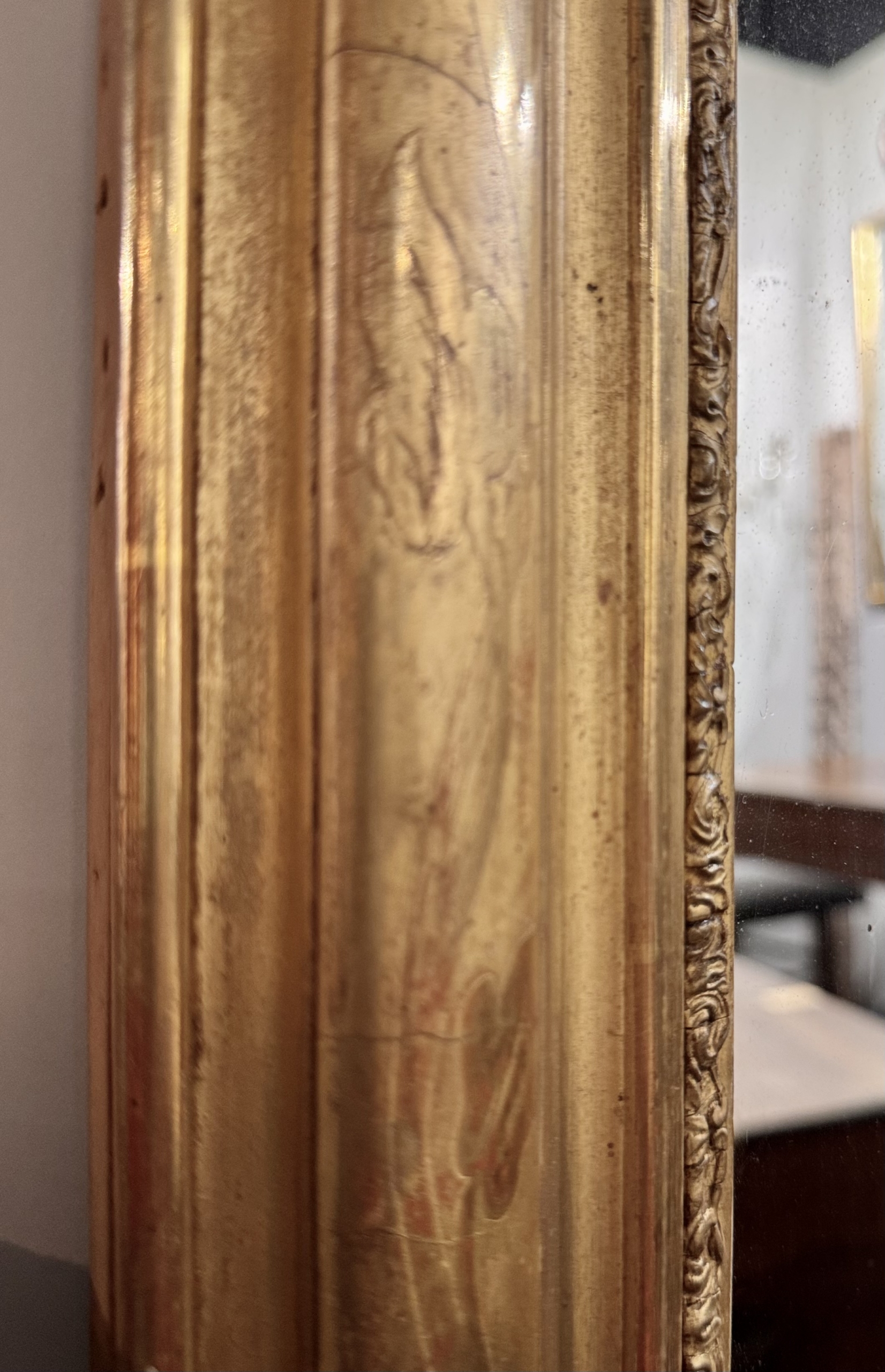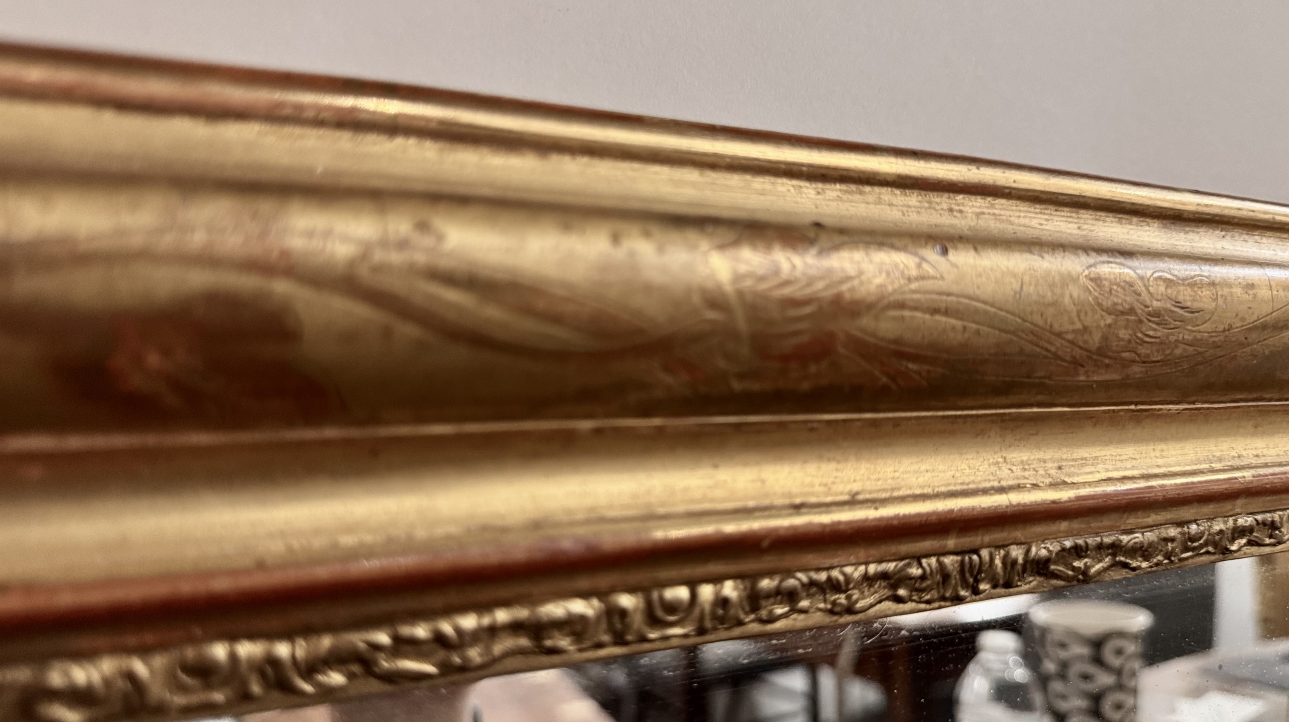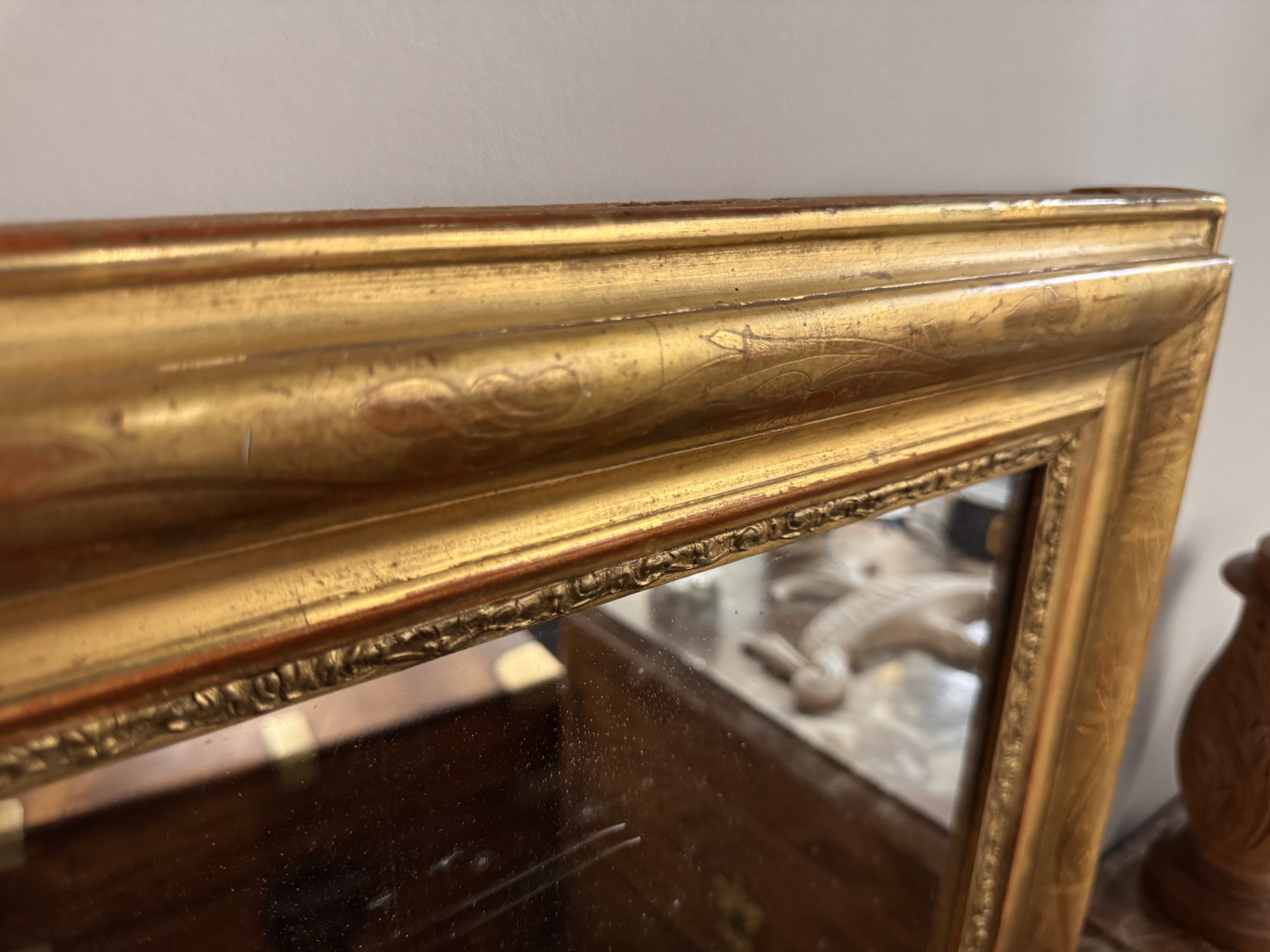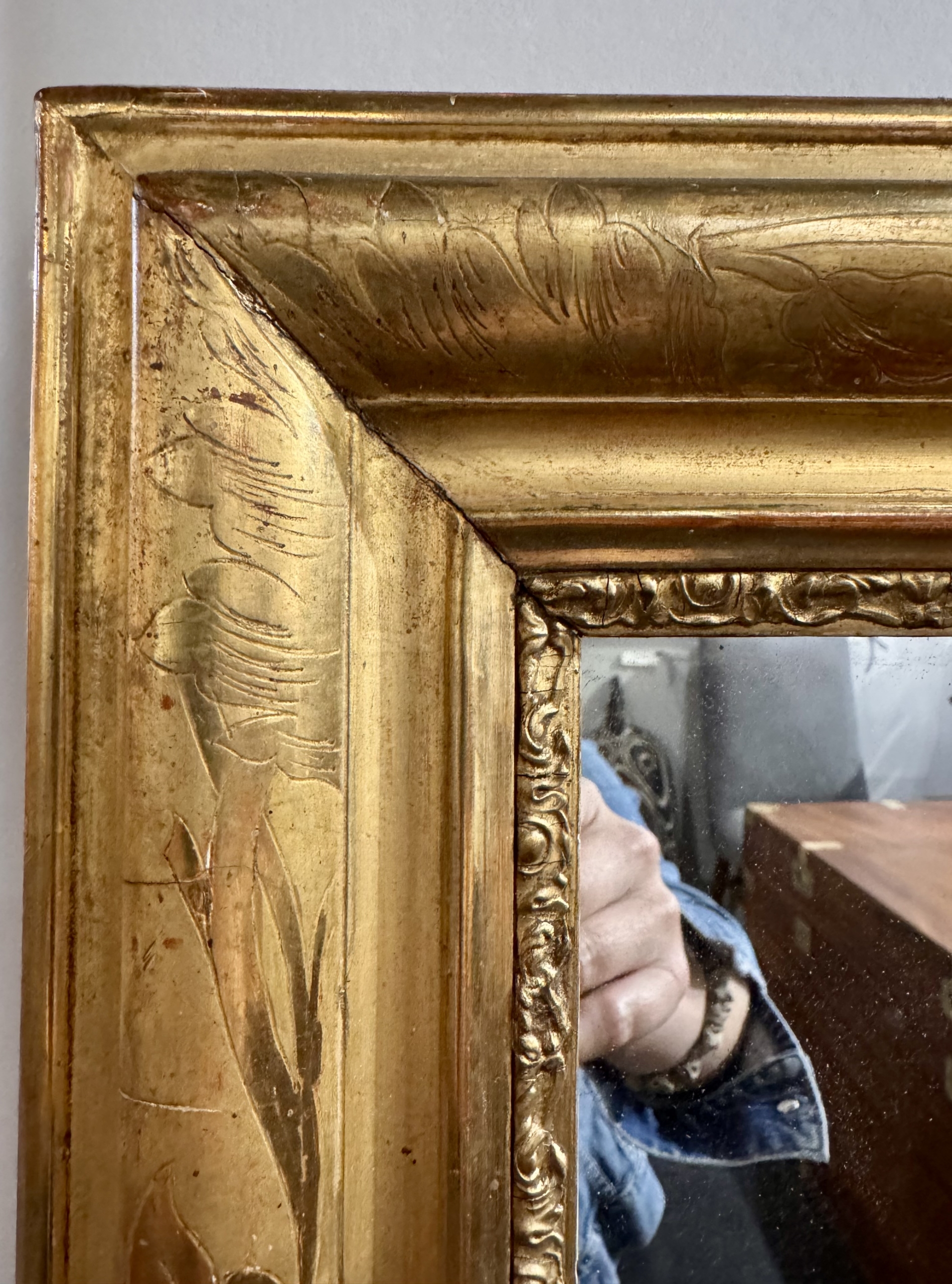 Louis Philippe Mirror with squared edges. This Louis Philippe mirror is carved and water gilt in burnished and matte gold leaf with a red bole showing through where the frame has been cleaned over the years. The carving is of a typical floral and leaf garland. Mirror Glass is silvered.