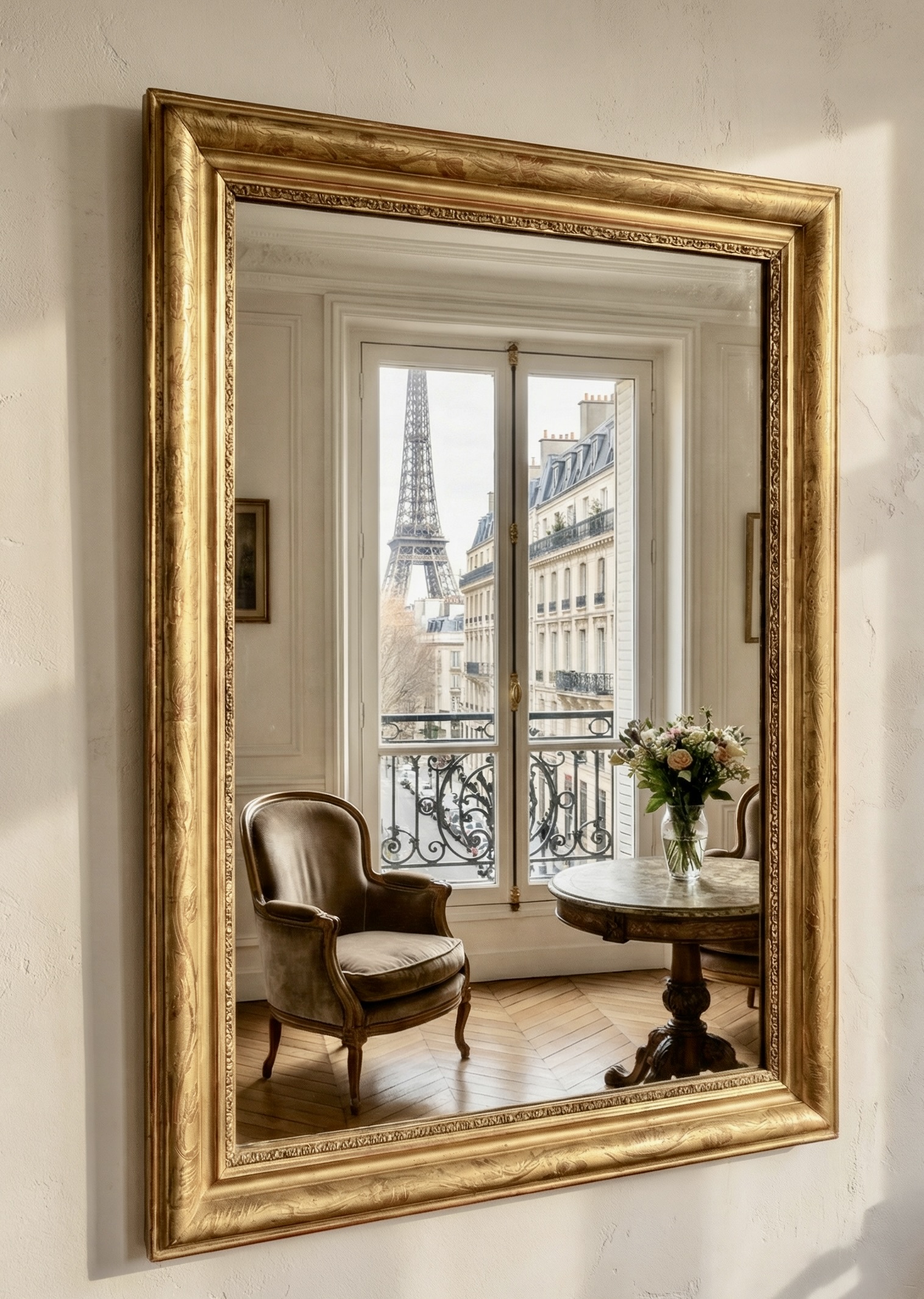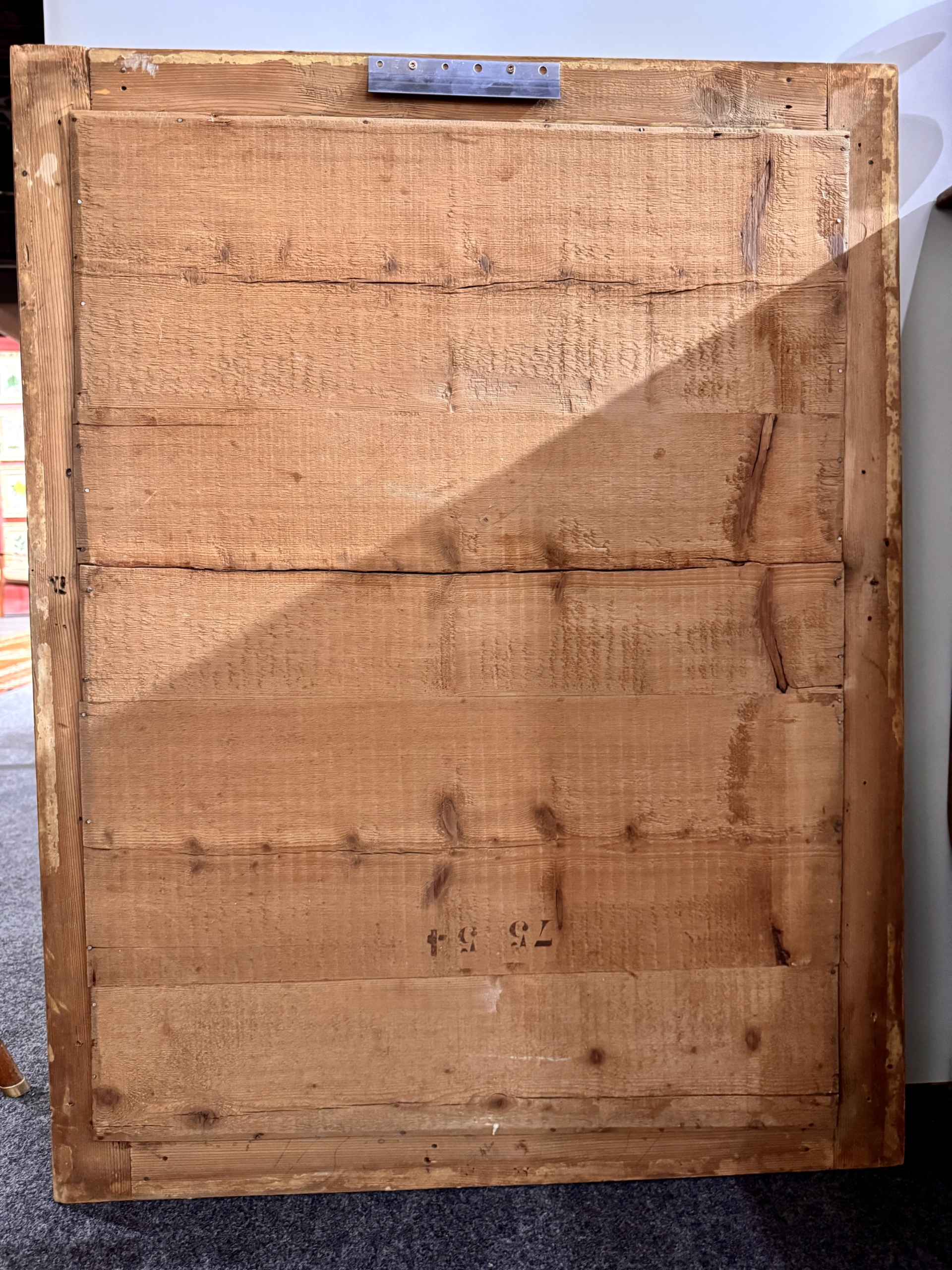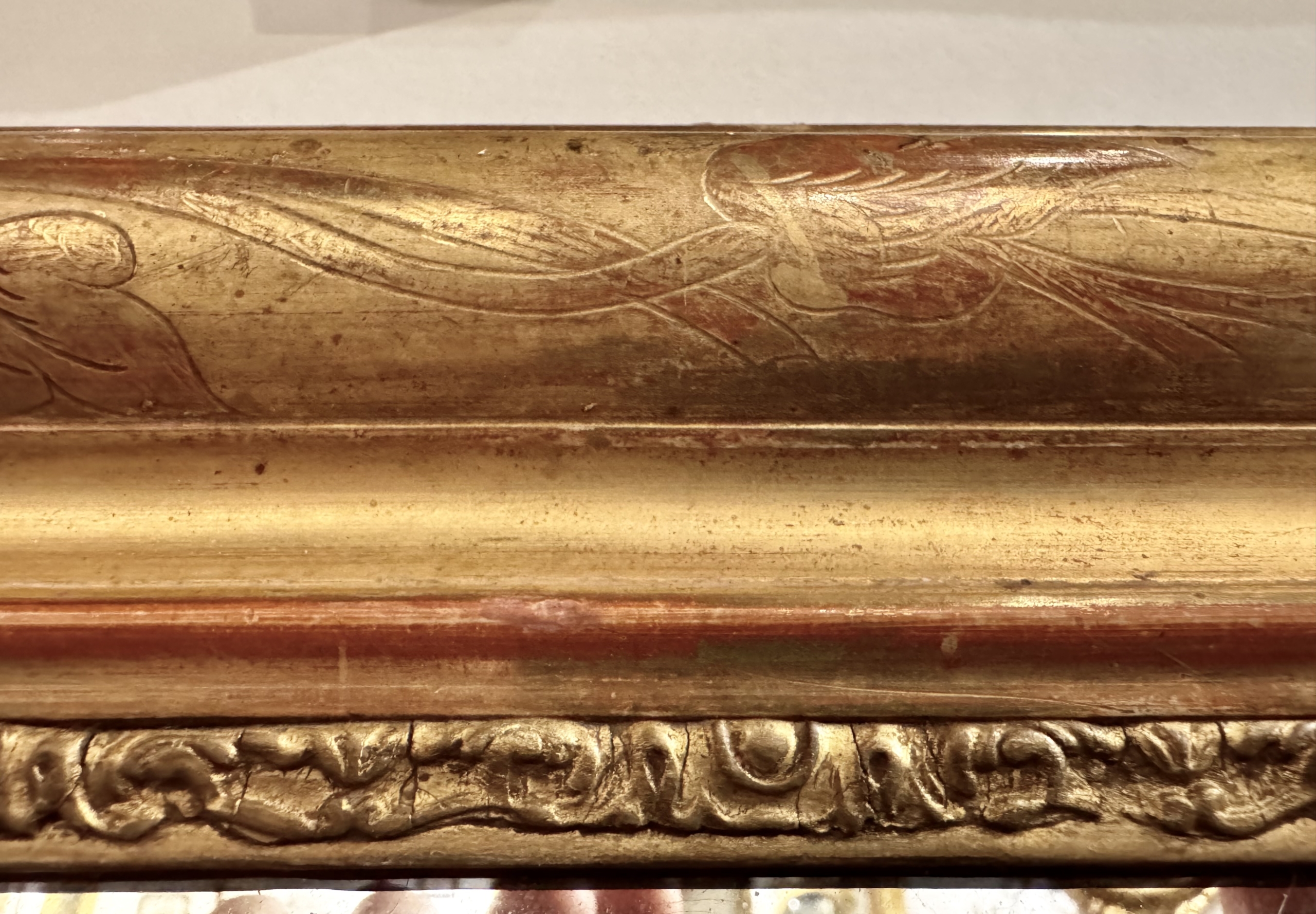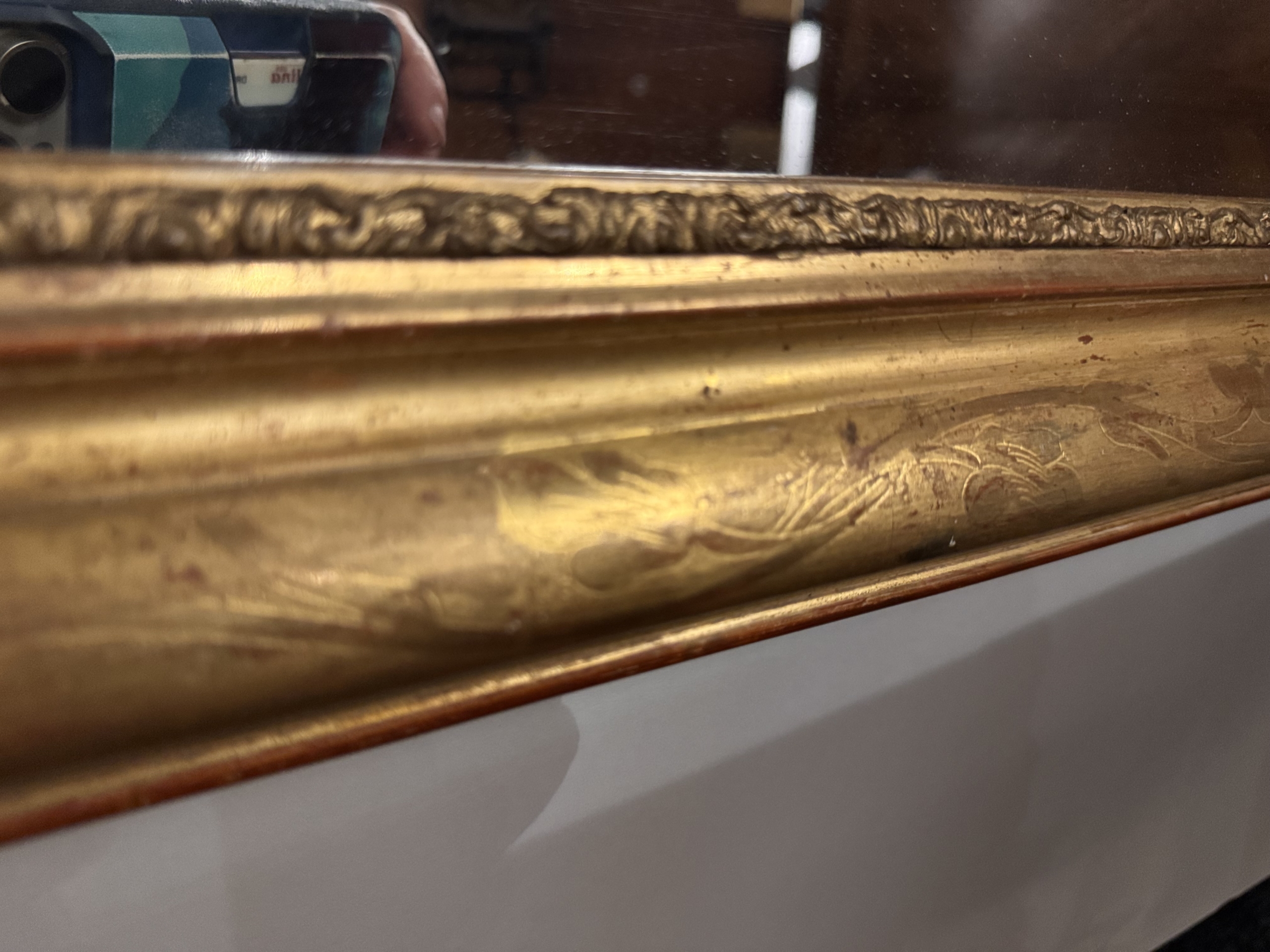 Louis Philippe Mirror with squared edges. This Louis Philippe mirror is carved and water gilt in burnished and matte gold leaf with a red bole showing through where the frame has been cleaned over the years. The carving is of a typical floral and leaf garland. Mirror Glass is silvered.