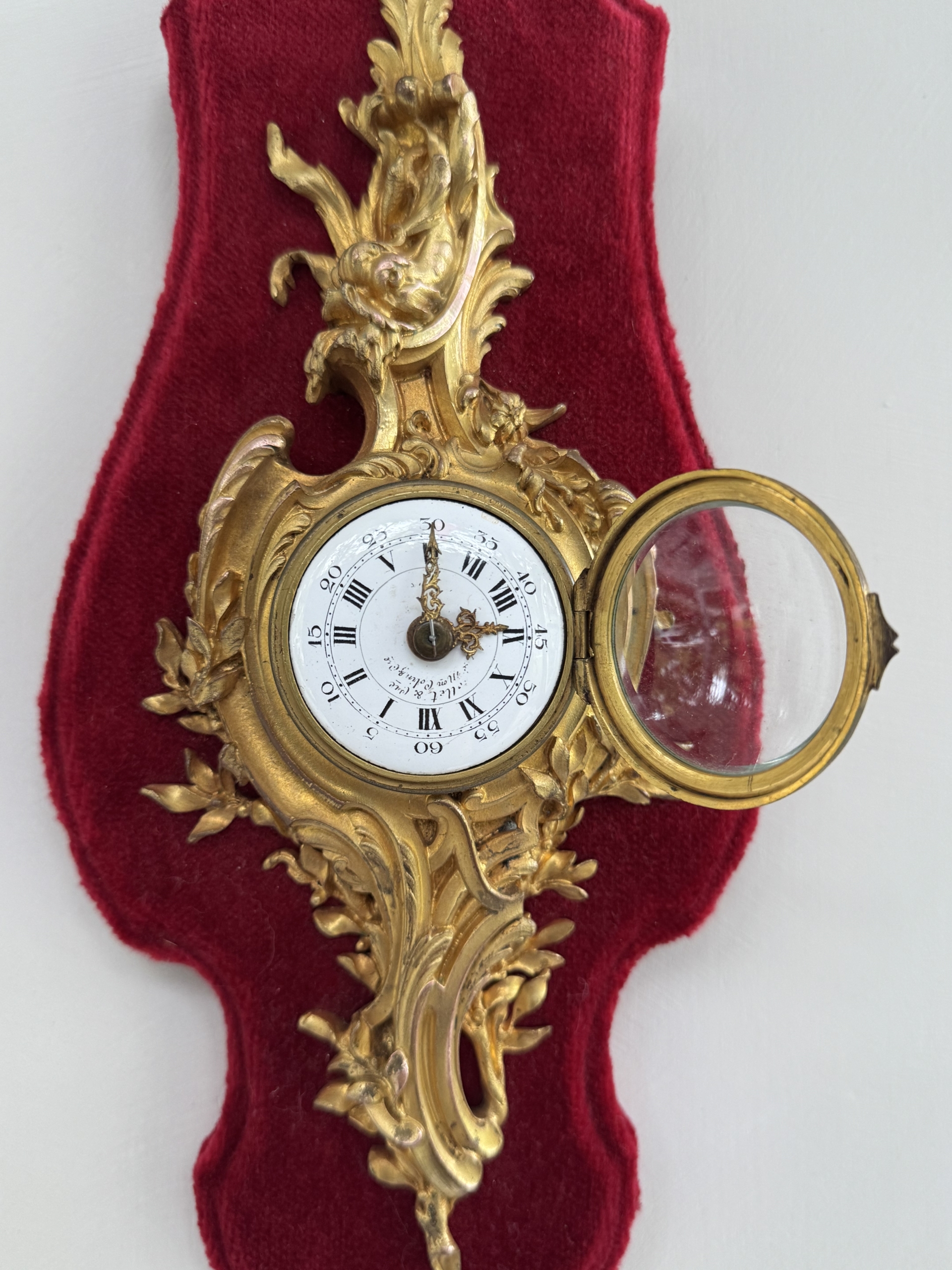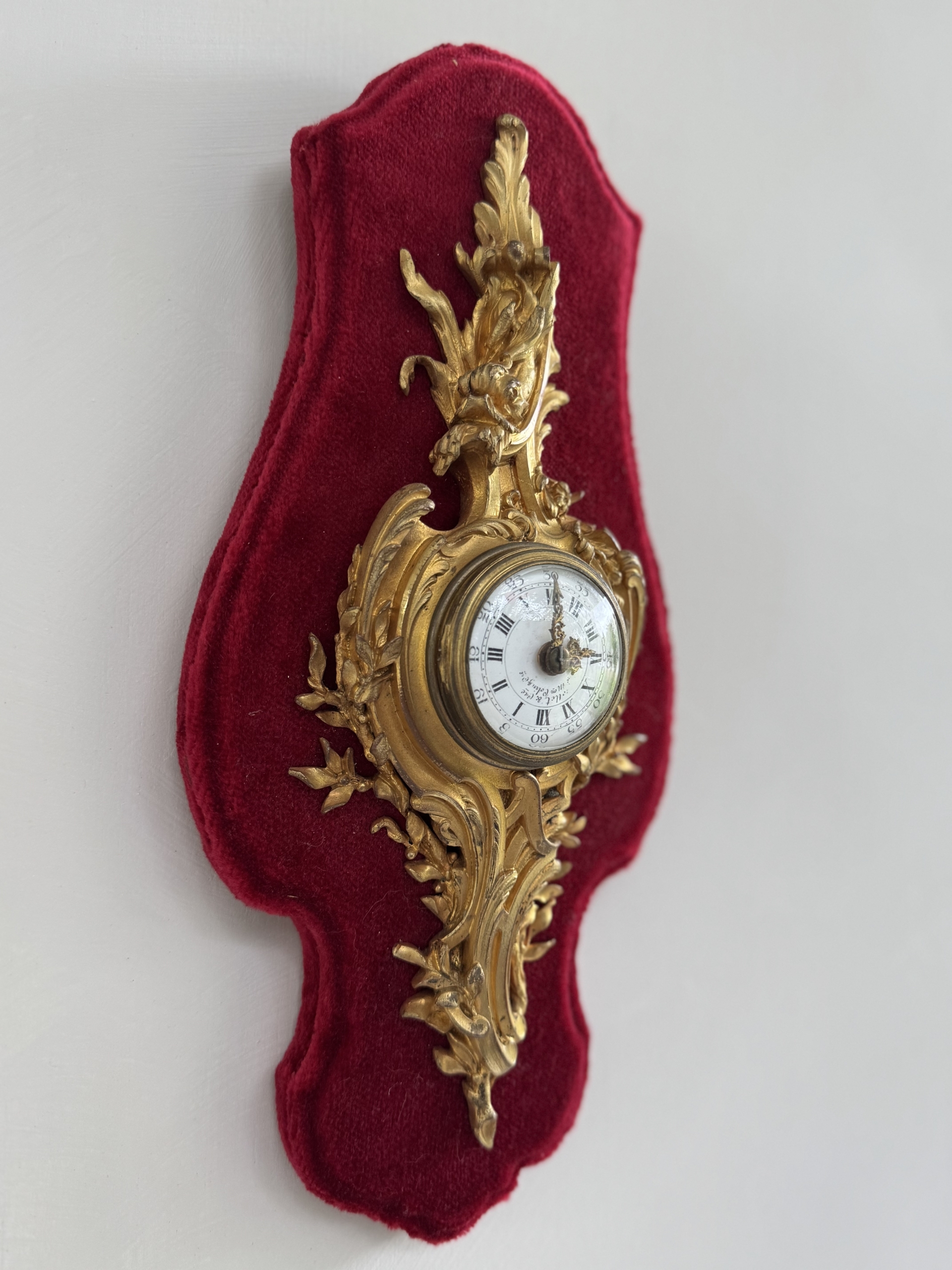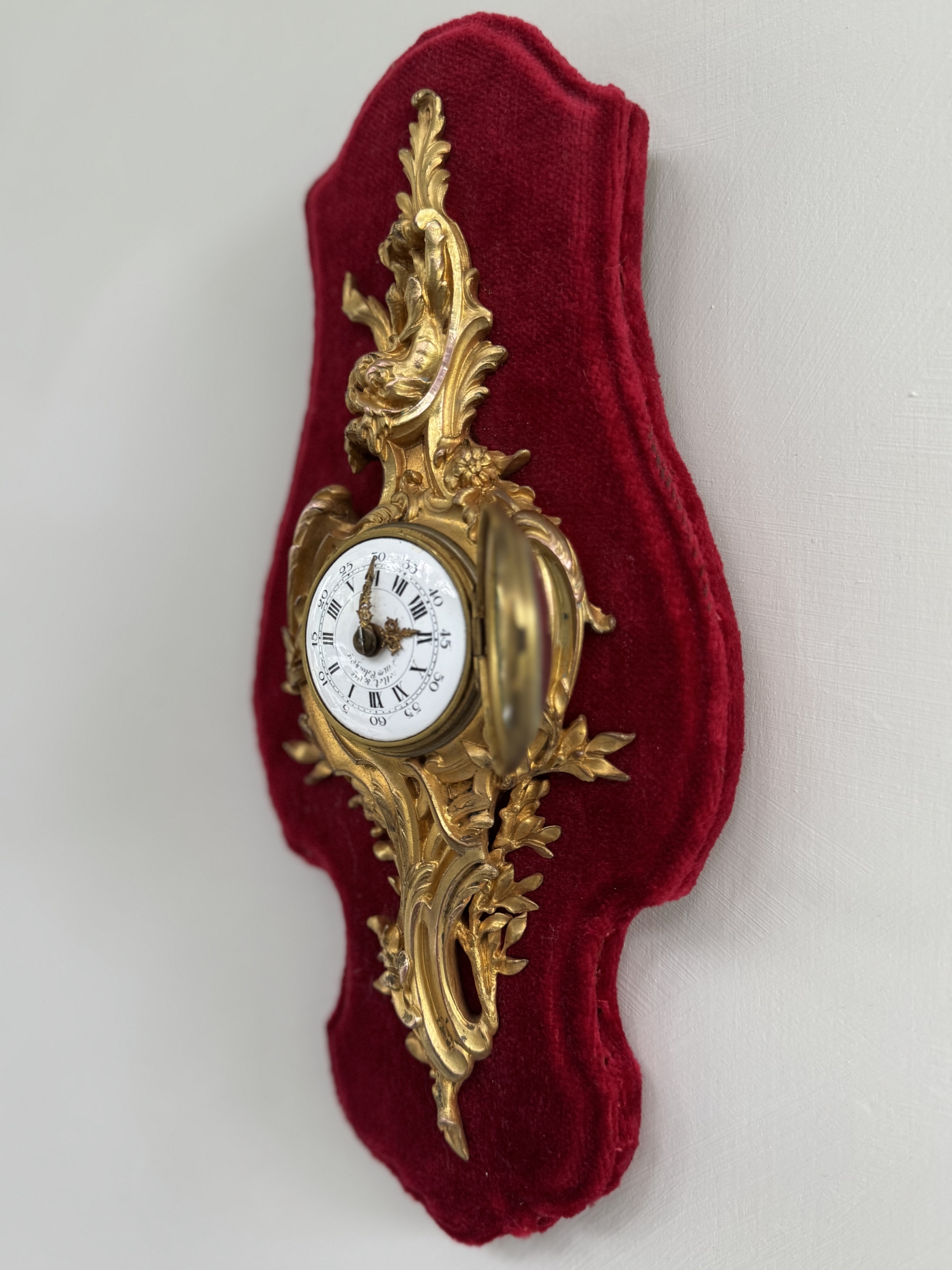 This Louis XV st. Cartel or wall clock in ormolu with its flowing rococo design and aquatic motif is in excellent condition having been refurbished and with its original key. Clock is petite and mounted nicely on a red velvet covered plaque. Clock workings are accessible from the front and back.