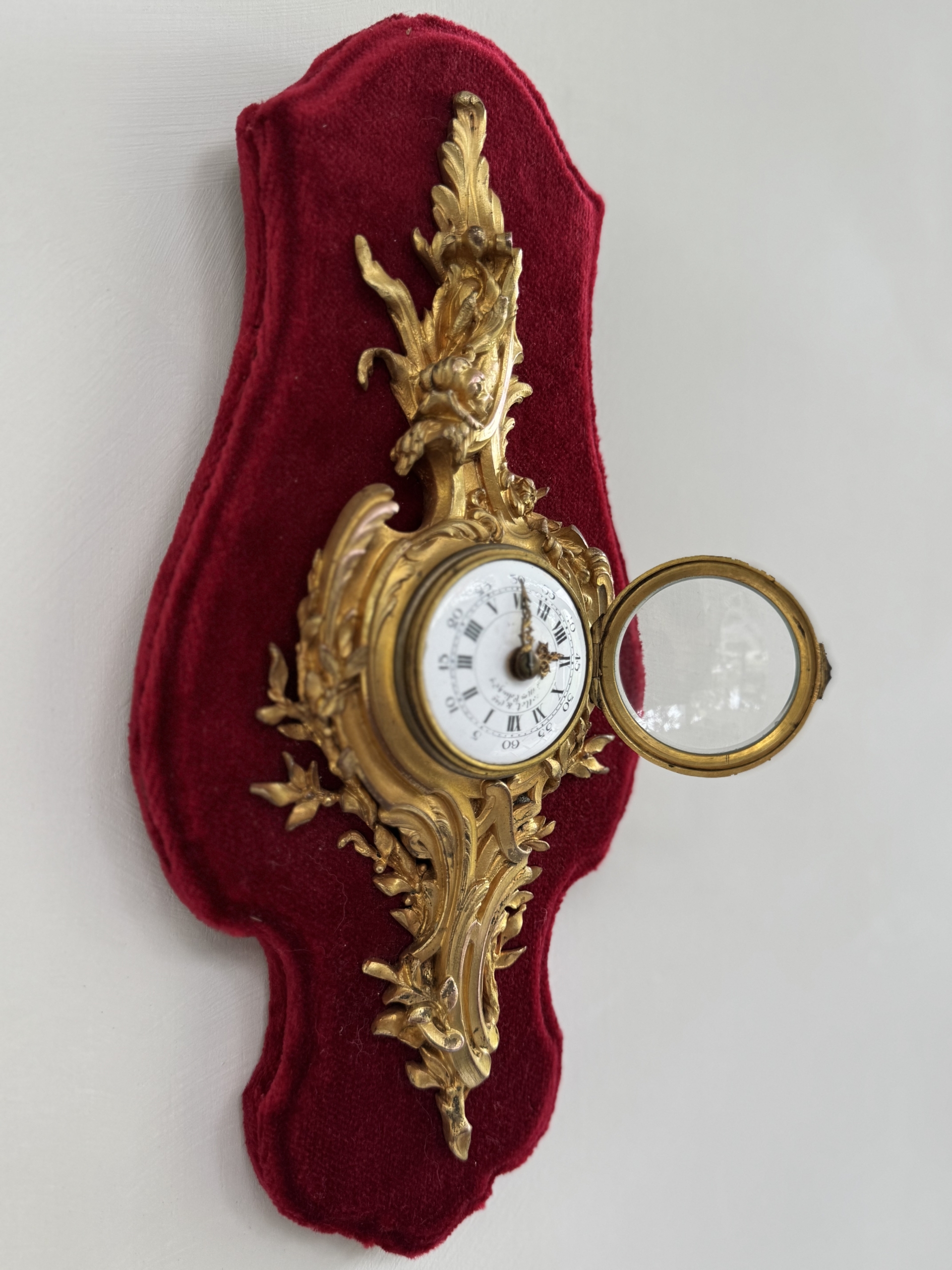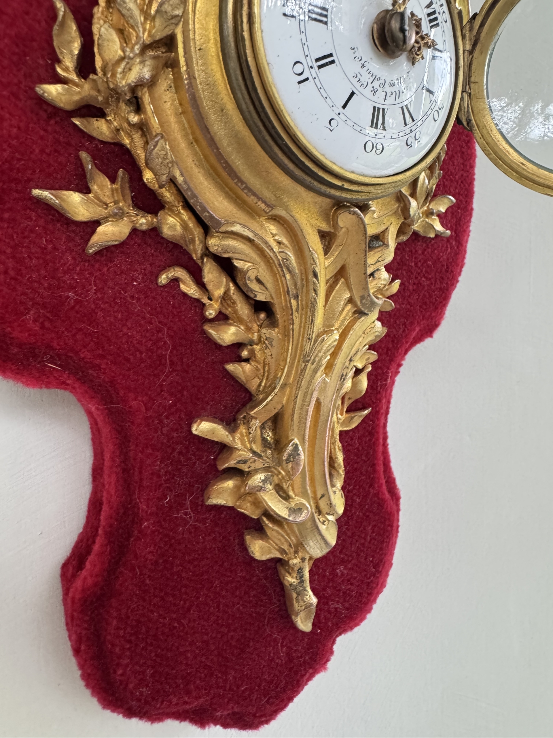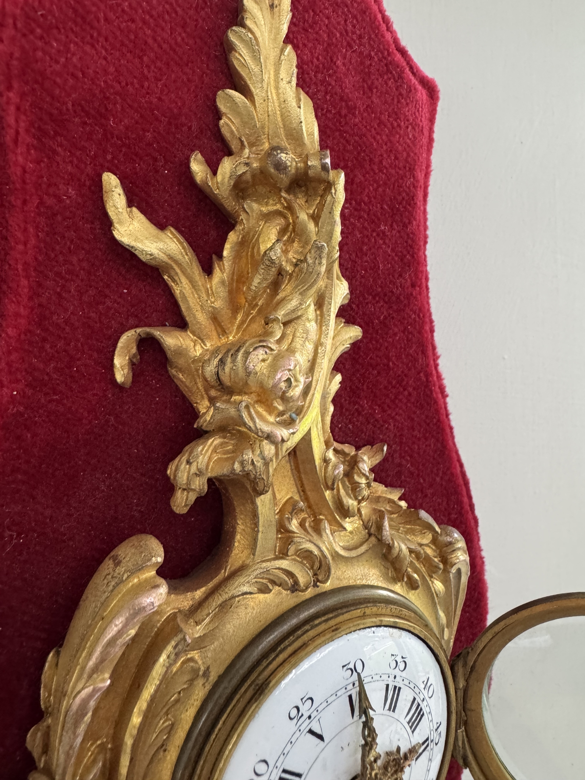 This Louis XV st. Cartel or wall clock in ormolu with its flowing rococo design and aquatic motif is in excellent condition having been refurbished and with its original key. Clock is petite and mounted nicely on a red velvet covered plaque. Clock workings are accessible from the front and back.