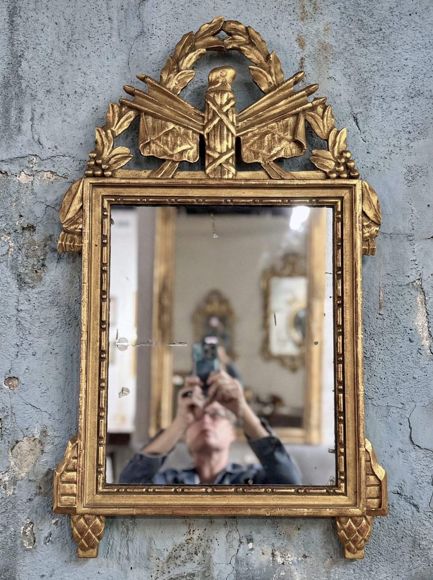 The carvings represent symbols of the revolution, cannon balls, the French hat, laurel and flags. Original silvered mirror with age.